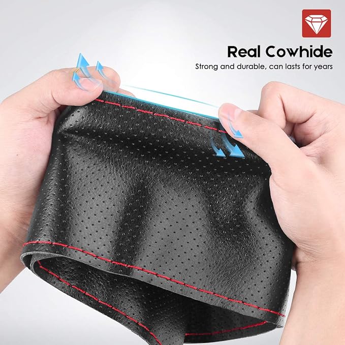 - HIGH QUALITY LEATHER, SOFT AND COMFORTABLE - Made of real cowhide, very solid and elastic, even pulling won't break. With surface coating design, it is durable and can be used for several years. Compared to PU leather, it feels softer and more comfortable, giving you a better driving experience.