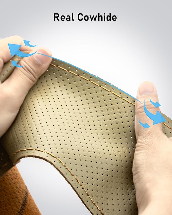 - HIGH QUALITY LEATHER, SOFT AND COMFORTABLE - Made of real cowhide, very solid and elastic, even pulling won't break. With surface coating design, it is durable and can be used for several years. Compared to PU leather, it feels softer and more comfortable, giving you a better driving experience.