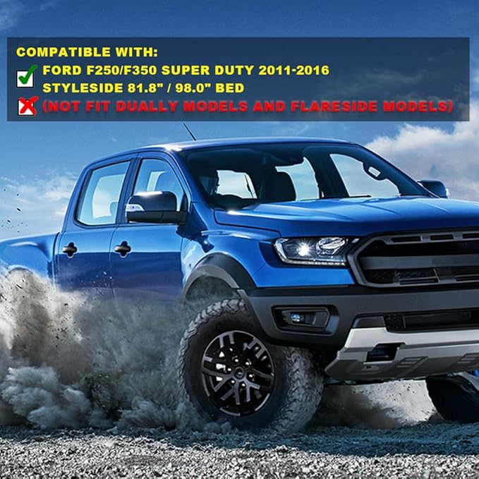 - COMPATIBILITY-Compatible with 2011-2016 Ford F250 F350 Super Duty Styleside with 81.8" / 98.0" bed length models only (Do not fit Dually models and Flareside models)