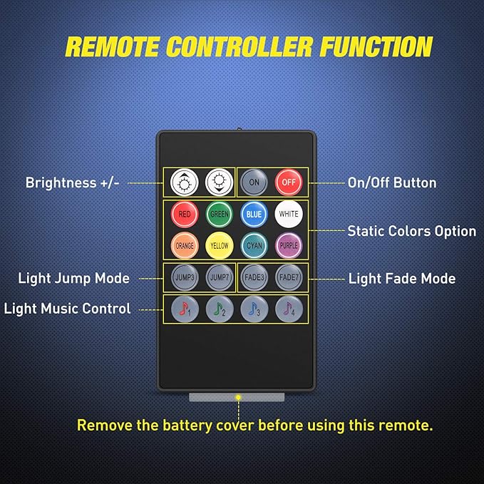 - Easy To Install: First plugged into a USB port, then peel the back double-sided tape, paste the light strips on the car floor. Plug and play with the wireless IR remote control