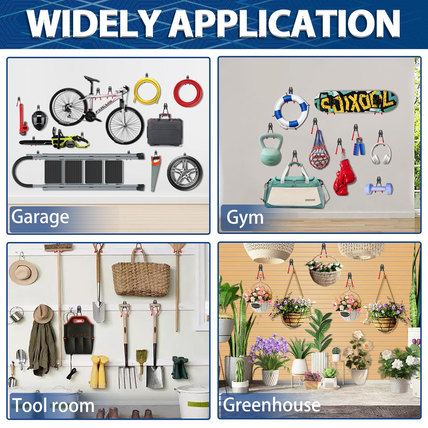 - Multi-Use Utility Hooks: The storage hooks for hanging in garage are ideal for garage, garden, shop, basement, warehouse, shed, or man cave, etc occasions. Our garage hooks for hanging can provide a great solution to use garage storage space more efficiently, the garage organization can hang various items like garden tools,ladders, bikes, strollers, chairs and so much more
