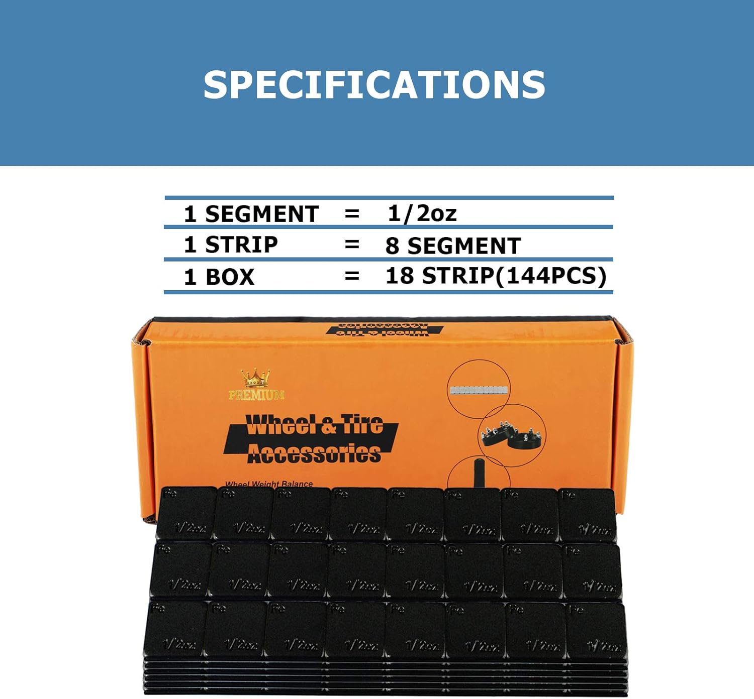 - Specification: Black Weights, 1/2 (0.5 oz) stick-on wheel weight balance,1 strip=8 segments, 1box=18 strips=144 pcs. Precision segments perform an accurate balance