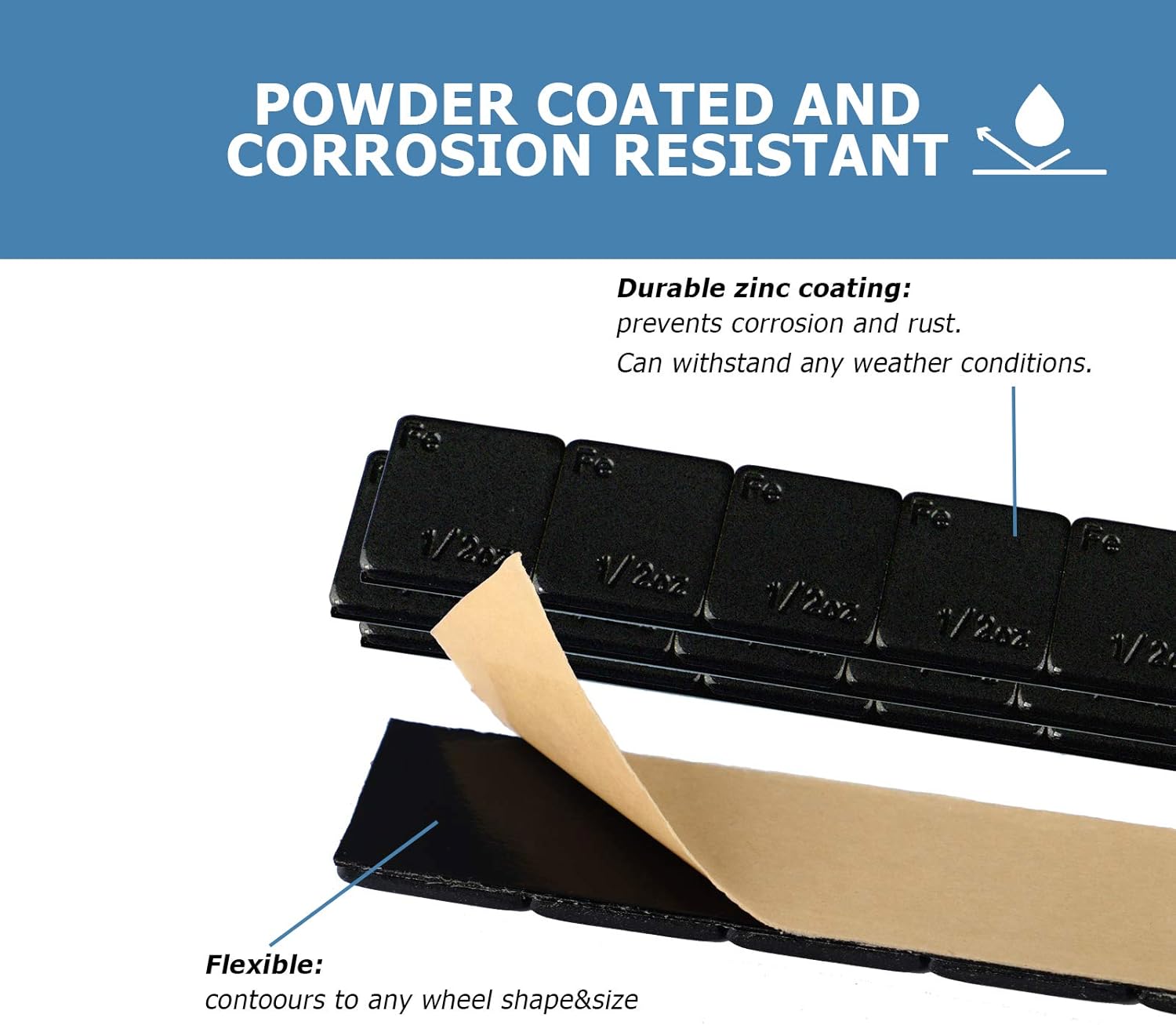 - High quality for durability: The balance are treated with a galvanized coating to prevent corrosion and rust, and can withstand any weather conditions your car normally experiences. Meanwhile, our wheel weights feature rounded corner stamping to easily contouring any wheel shape and size