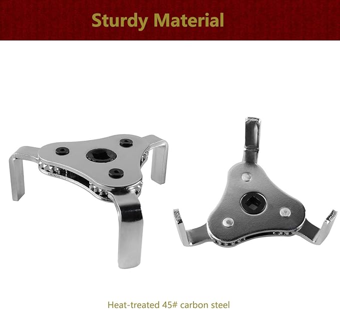 - Versatile Application: Adjustable oil filter wrench fits filters from 2-1/8" to 4-1/2" across various vehicles. The low-profile design and three heat-treated carbon steel jaws ensure a secure grip, even in tight spaces.