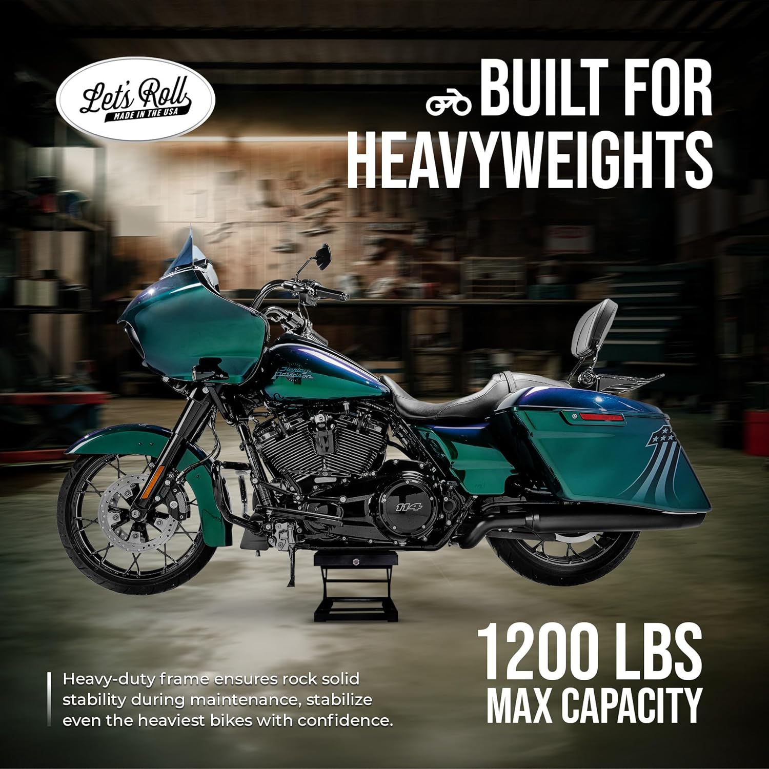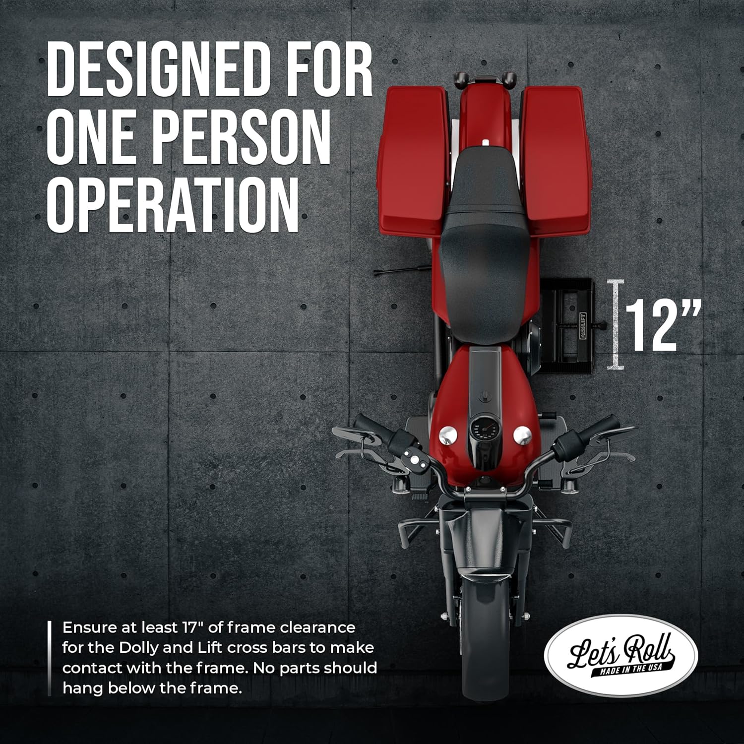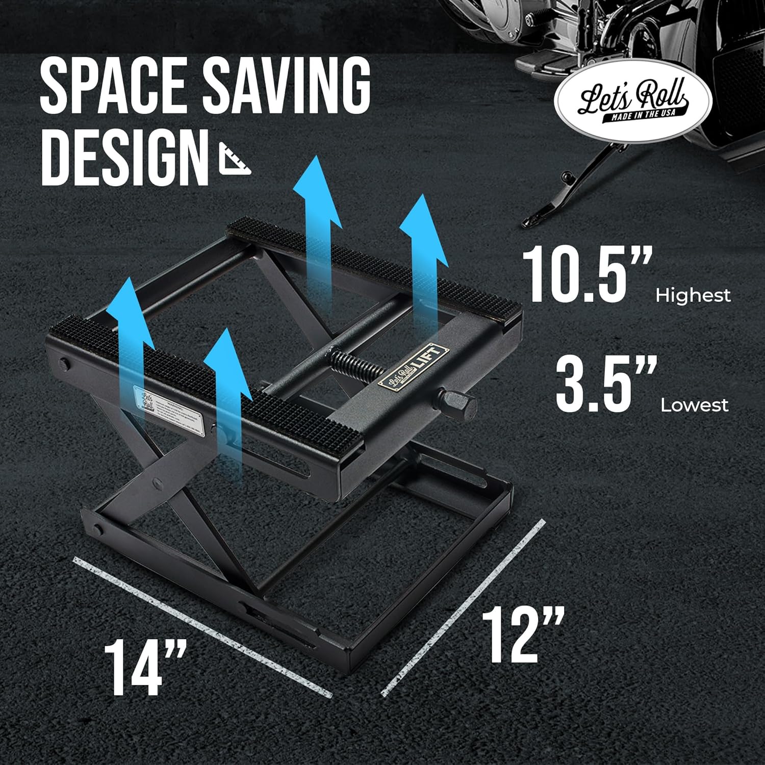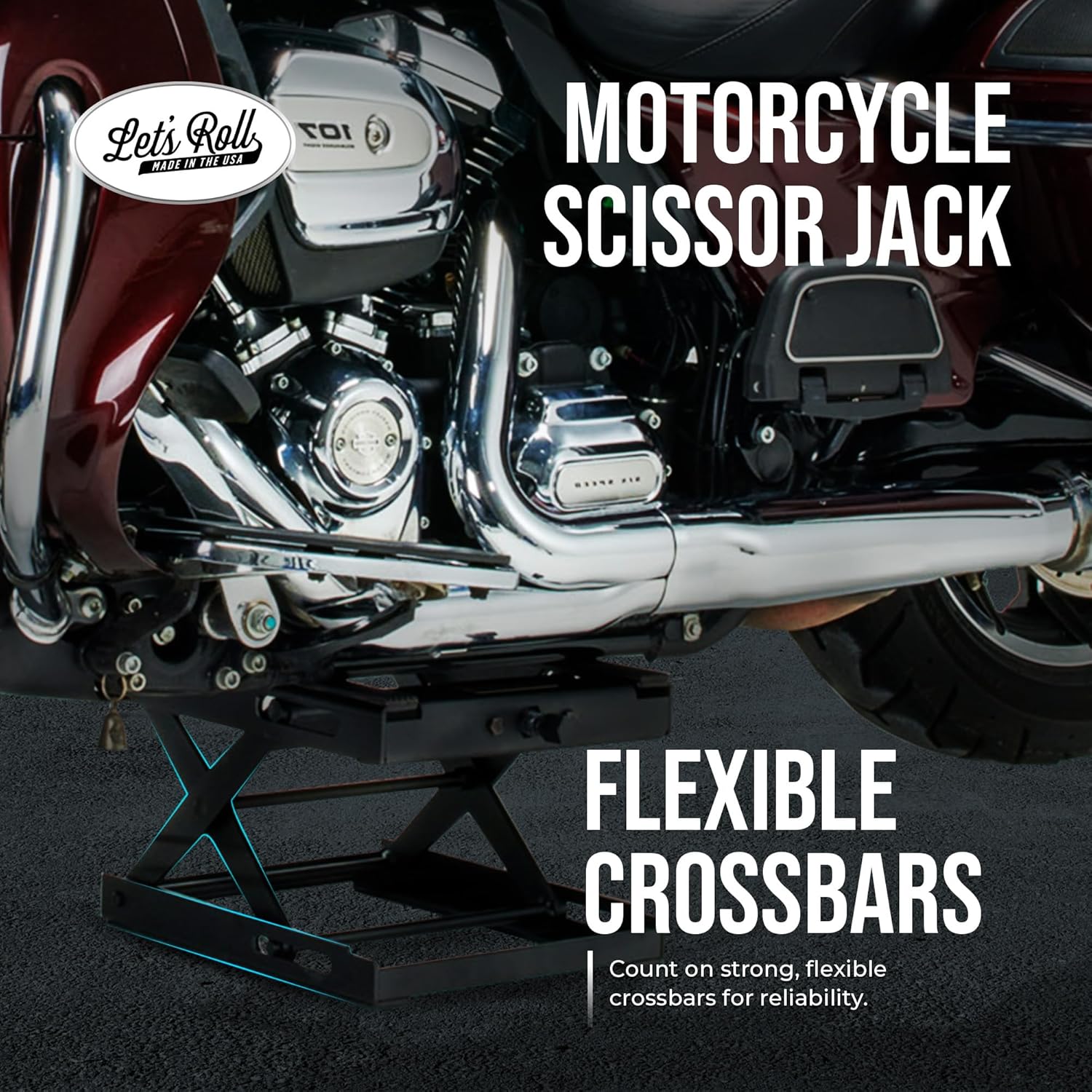 Let's Roll Standard Motorcycle Lift Jack - 1200 LB Heavy Duty Scissor Jack Stands, Scissor Lift Jacks, Motorcycle Accessories, Stable Garage Lifts with Mobility for Maintenance - Made in The USA