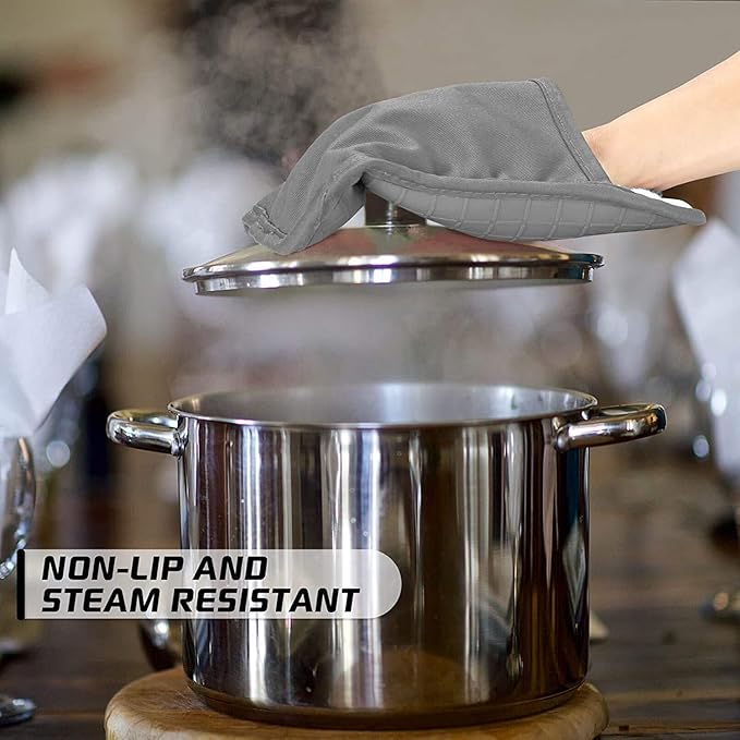 - Heavy-Duty: Whether you're draining boiled pasta or potatoes, our high-quality, heat, and steam-resistant kitchen mittens and pot holder set will keep you protected without absorbing any liquids