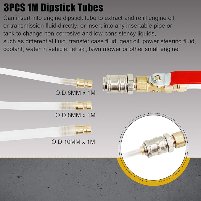 - YSTOOL fluid extractor and dispenser tool kit includes 3PCS 1M dipstick tubes, can insert into engine dipstick tube to extract and refill engine oil or transmission fluid directly, no more need to crawl about under lifted vehicles and avoid mess. Also can insert into any insertable pipe or tank to change non-corrosive and low-consistency liquids (such as differential fluid, transfer case fluid, gear oil, power steering fluid, coolant, water) in vehicle, jet ski, lawn mower or other small engine