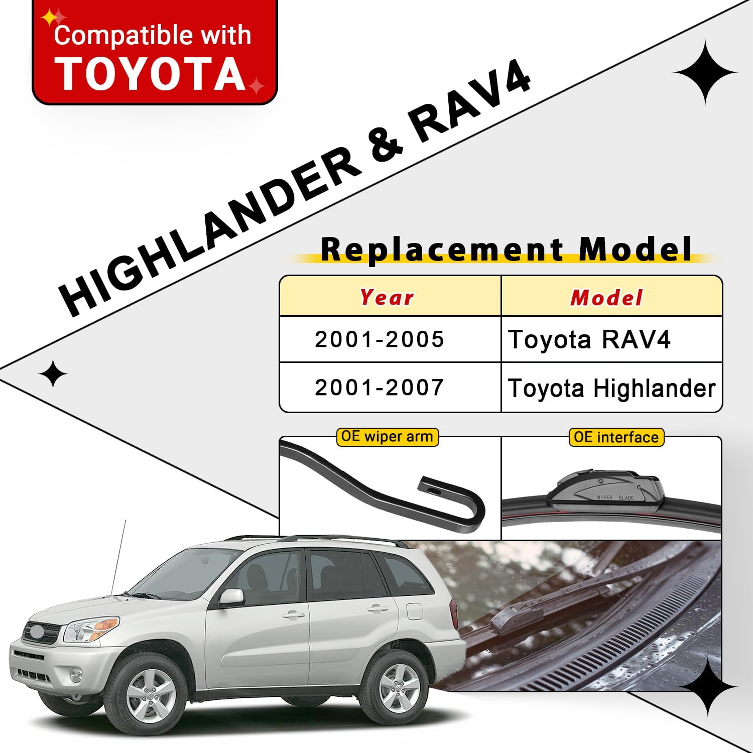 - {FITMENT1}: Replacement for 2001 2002 2003 2004 2005 2006 2007 Toyota Highlander 22inch + 19inch front with 12inch rear windshield wiper blades.