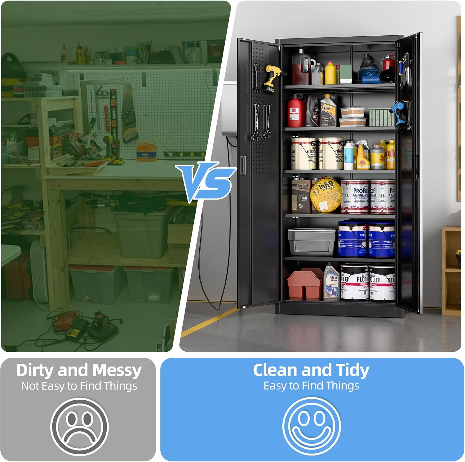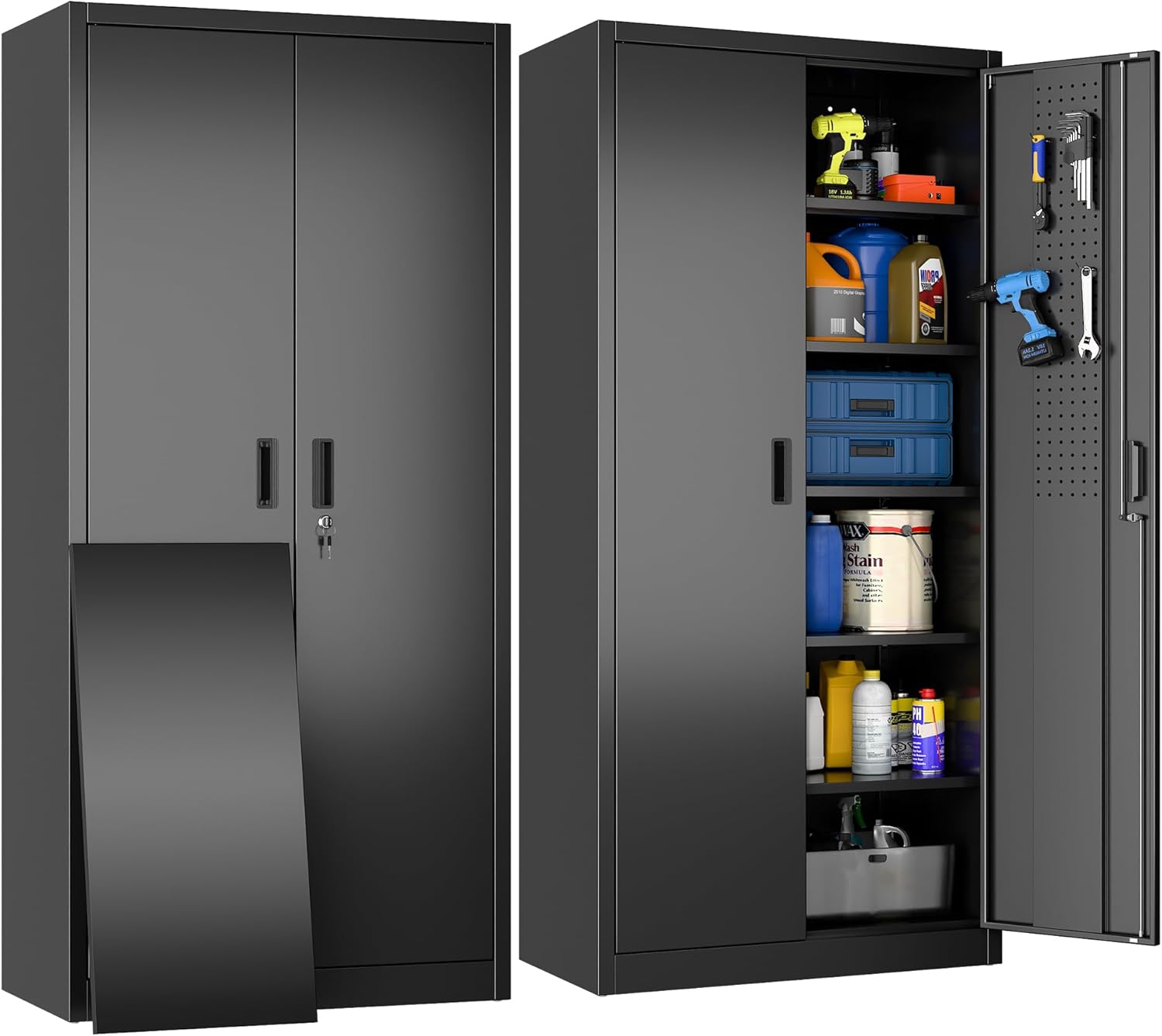 - New Upgrade:Metal Cabinet has lots of room to organize your belongings.In order to meet customer storage requirements, the newly upgraded metal cabinet with Pegboard(Including 4 hooks) for storing tools and other items, fully utilizing space