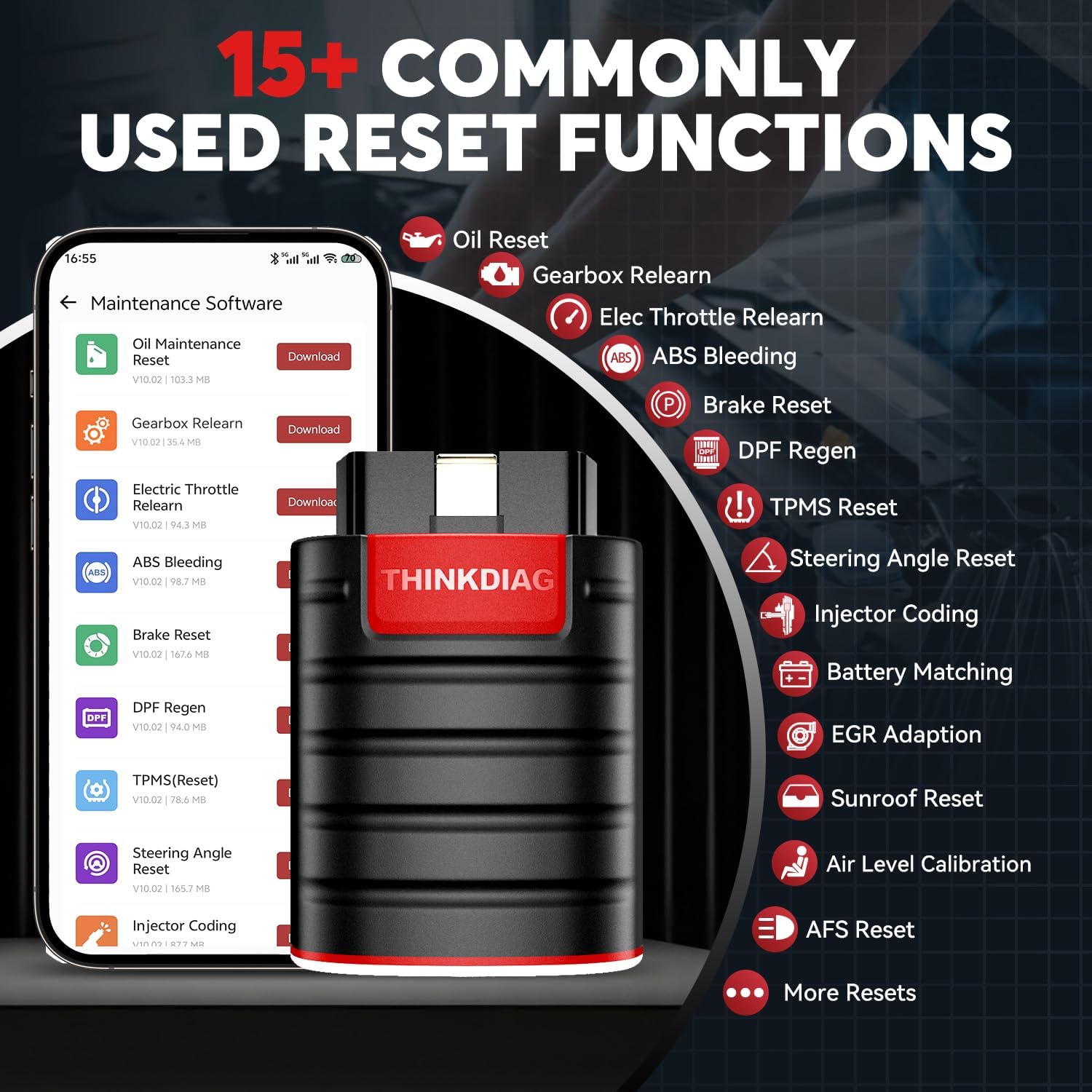 - 【🔧 15+ Advanced Reset & Calibration Functions】The Thinkdiag scanner provides 15+ professional maintenance functions, including:✔ Oil Reset | ✔ ABS Bleeding | ✔ Injector Coding | ✔ SAS Reset✔ TPMS Reset | ✔ BMS Reset | ✔ Transmission Adaptation | ✔ AFS Reset | ✔ Sunroof Calibration | ✔ Brake Reset | ✔ Suspension Relearn | ✔ Electronic Throttle Relearn | ✔ Seat Calibration | + More reset/relearn/calibrate/adaptive functions under automotive full systems diagnostic menu. Ideal professional OBD-II scanner for mechanics and DIY enthusiasts, Thinkdiag delivers factory-level diagnostics with adaptive relearn capabilities for precise vehicle servicing.