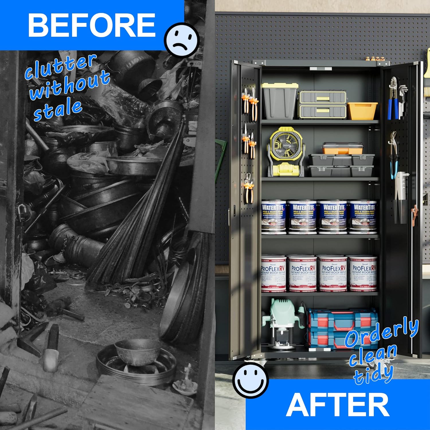 - New Upgrade:Metal Cabinet has lots of room to organize your belongings.In order to meet customer storage requirements, the newly upgraded metal cabinet with Pegboard(Including 4 hooks) for storing tools and other items, fully utilizing space