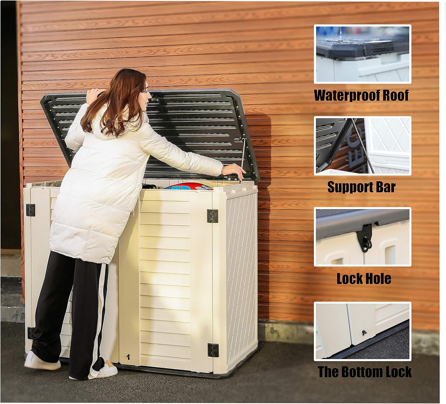 - 📏【SHED SIZE】External Dimension: 50 in. L x 29 in. W x 41 in. H /Internal dimension: 46 in. L x 25.2 in. W x 38.4 in. H/ Generous storage capacity of 27 cubic feet, enough room for Bike, Lawnmower, Trash Cans, Patio Accessories, please check before purchase if for bulky goods storage.