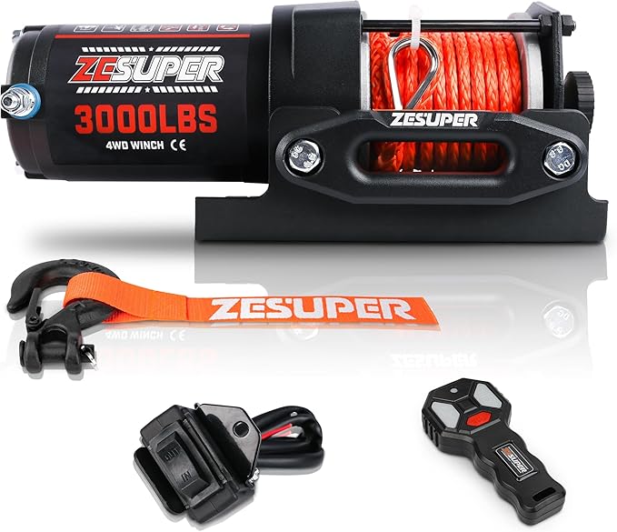 ZESUPER 3000 lb Electric Winch for ATV UTV Trailer Boat Synthetic Rope Winch 12V DC Off Road Towing Winches with Wireless Remote Mounting Bracket