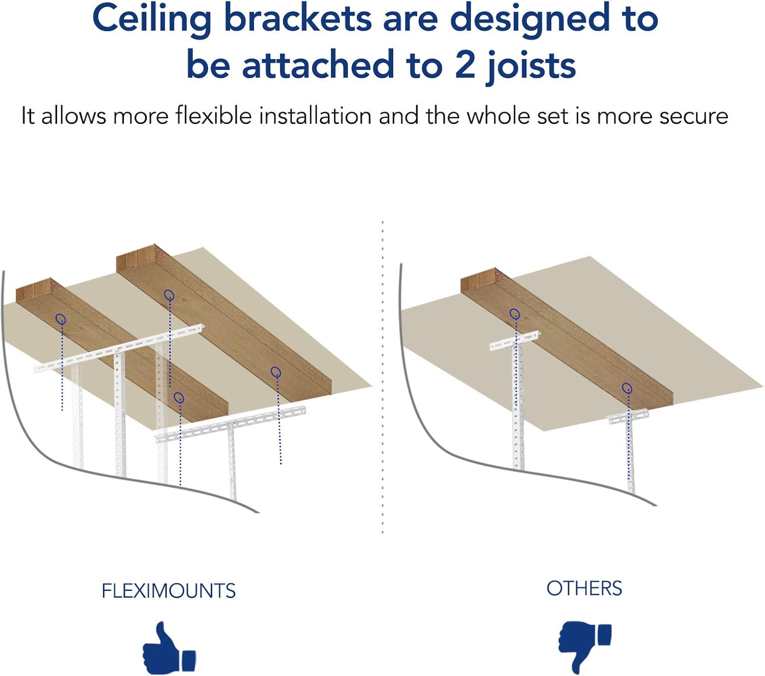 - STABILITY AND SAFETY:With our specially designed longer ceiling brackets that attach to two joists, FLEXIMOUNTS overhead garage storage racks are more stable and secure compared to others!