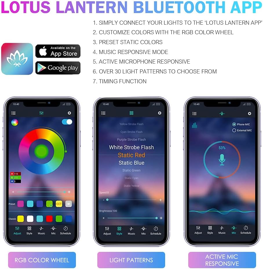 - Three Control Ways : Our underglow led lights for cars and interior lights for cars choose from Bluetooth control with the Lotus Lantern App (16 million RGB colors, music sync, 30+ patterns), a remote (8 preset colors, 4 lighting effects, 4 sound modes), or control box features a high-sensitivity mic for responsive sound activation.