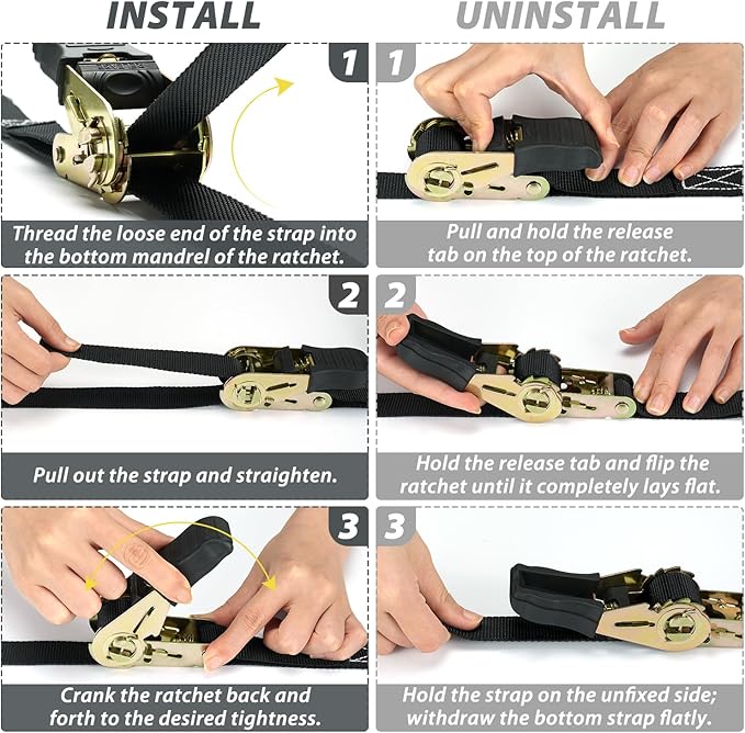 - Easy to Maneuver: Thanks to the release lever and ratchet locks, it won't take a long time to get your head around this ratchet tie-down strap. With simple operation. You can secure the cargo in place and hit the road in no time! Once you've done transporting, use the included storage bag to stash the tie-down strap away for easy organization.