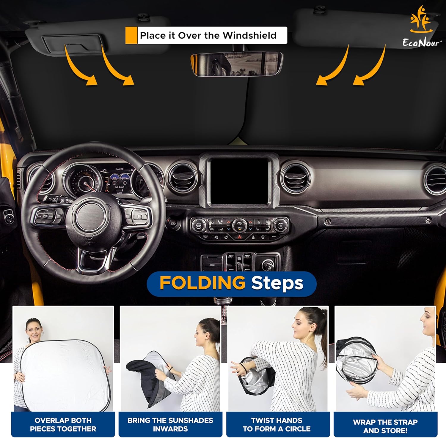 - Ultimate Sun Protection: Shield your vehicle's interior from the sun's harmful UV rays with our EcoNour 2 piece sun shade for car windshield, ensuring comprehensive sun protection on every drive.