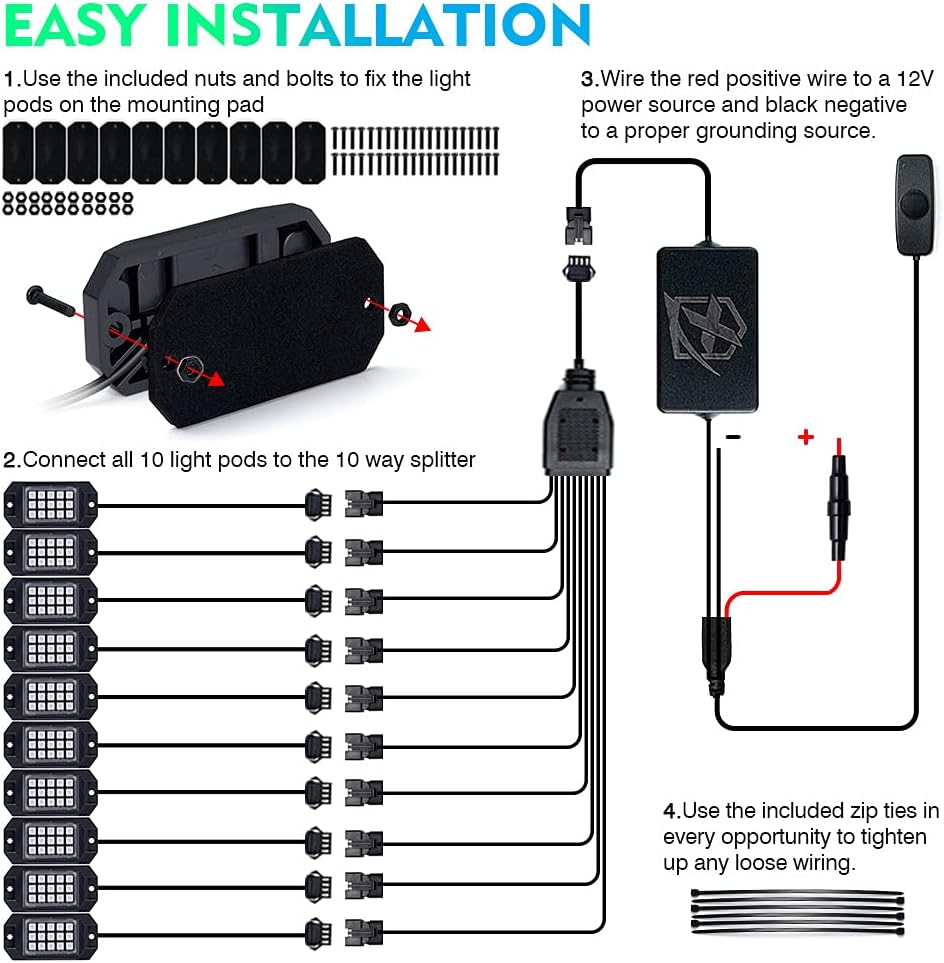- Easy Installation : Lightweight rectangular shapes make installation simple. Use the included hardware to mount the LED rock pods under your vehicle or in the wheel wells. Perfect for trucks, cars, SUVs, UTVs, ATVs, RZRs, vans, motorcycles, boats, and more. Also provides ambient lighting wherever you need it.