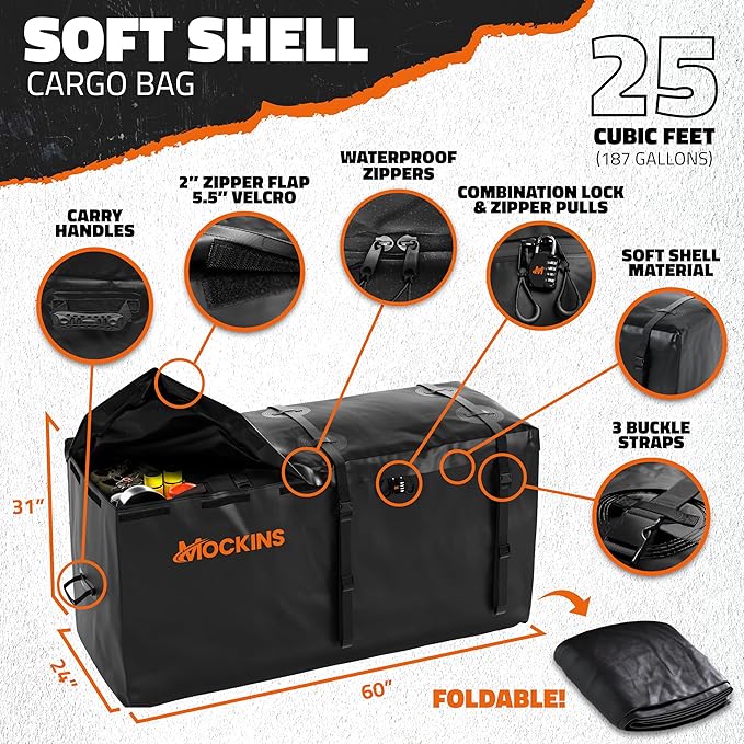- WATERPROOF CARGO BAG FOR HITCH CARRIER : At 60"x24"x31", the Mockins Tow Hitch Cargo Carrier Bag provides 25 cubic ft. of dry storage. Made from abrasion-resistant vinyl, this trailer hitch rack cargo carrier bag withstands all weather conditions. Equipped with waterproof zippers under a 2" flap with 5.5" Velcro closures, the hitch basket cargo carrier bag keeps your belongings dry. Robust seams resist rips, making it the ideal hitch bag to pair with the Mockins Cargo Racks for trailer hitch .