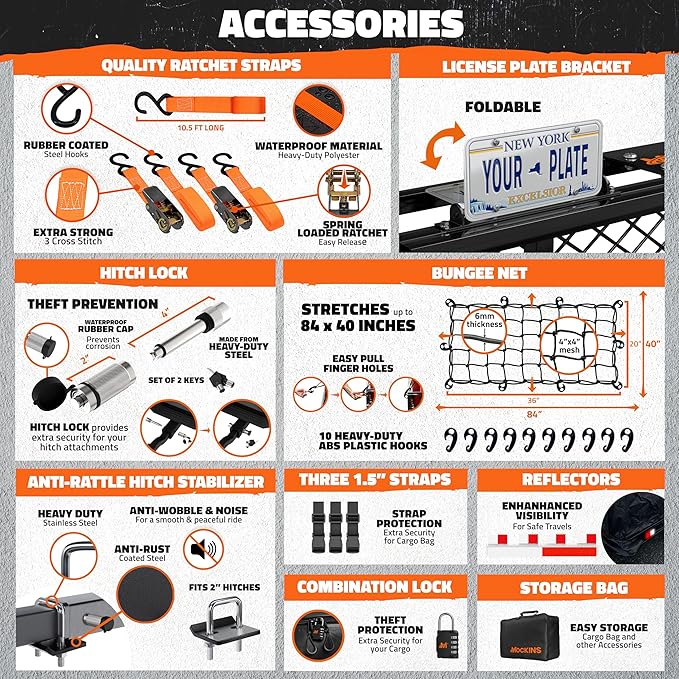 - CUSTOMER CARE COMES FIRST: At Mockins, we stand by our customers & the quality of our heavy-duty car luggage rack . That’s why we back this folding cargo hitch carrier set with a 10-year limited warranty. The bundle includes a trailer hitch carrier bag, license plate holder, buckle & ratchet straps, cargo net, bag lock, & carry bag. For any questions about your trailer hitch cargo rack bundle, our support team is ready to help. Transport gear with confidence on the Mockins Hitch Storage Rack !