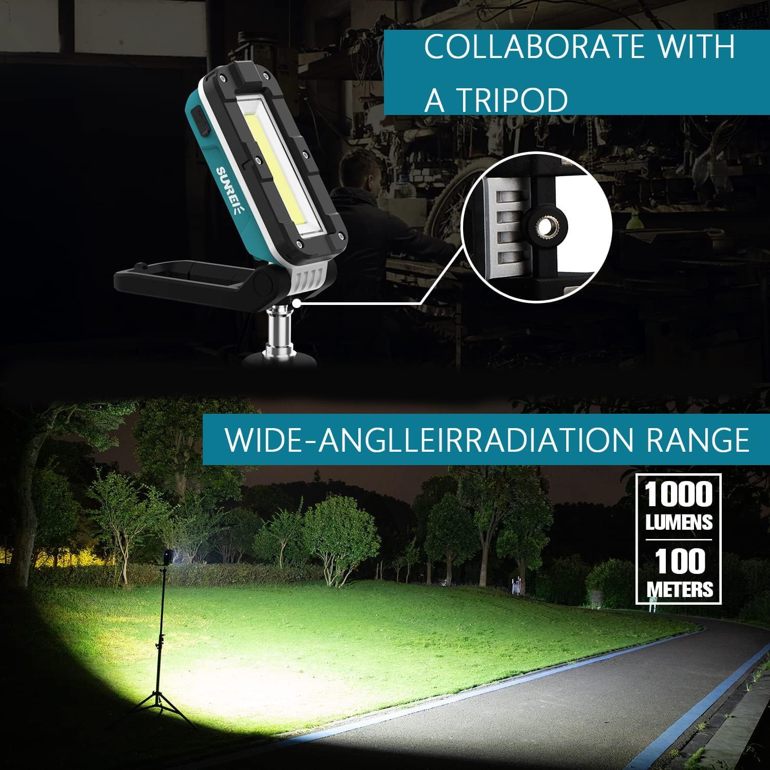 - [Hook Fixed Design]: The base has universal thread tripod interface; Magnetic features: Outdoor battery powered work light with magnets can be installed on metal surfaces in many complex workplaces. Hook design: portable work lights for mechanics can be hung on the tent and other objects that are not absorbed, completely release your hands, stable design makes your work easier
