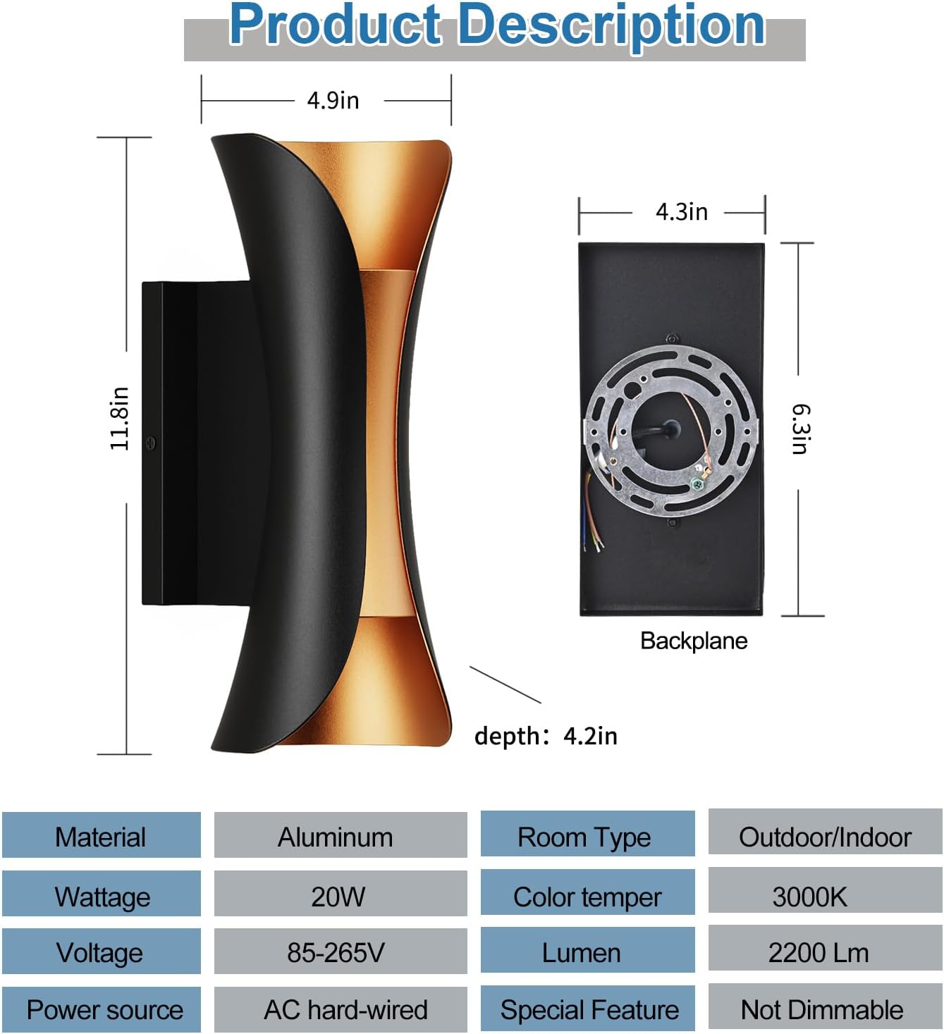 2-Pack Outdoor Wall Light LED 20W (H) 11.8in Aluminum - Black Gold Waterproof Exterior Lighting Fixture,3000K Warm,Up Down Porch Sconces Brightens to Patio,Garage,Front Door
