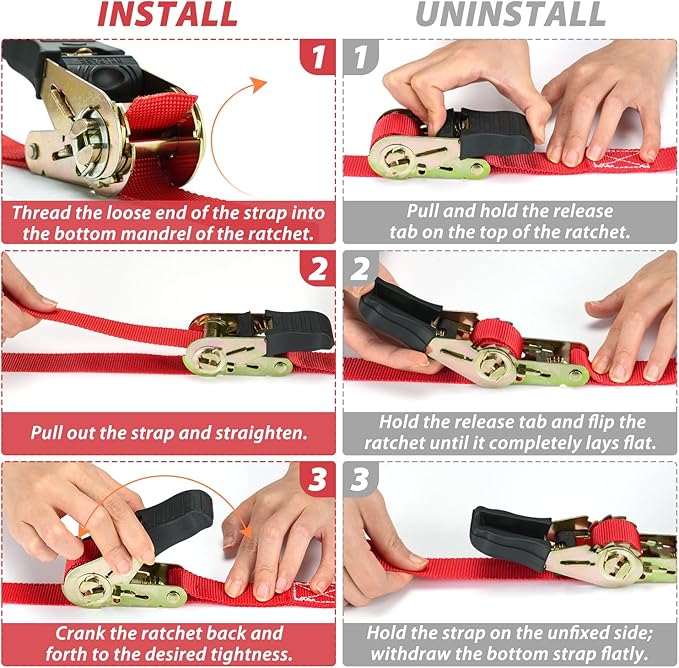 - Easy to Maneuver: Thanks to the release lever and ratchet locks, it won't take a long time to get your head around this ratchet tie-down strap. With simple operation. You can secure the cargo in place and hit the road in no time! Once you've done transporting, use the included storage bag to stash the tie-down strap away for easy organization.