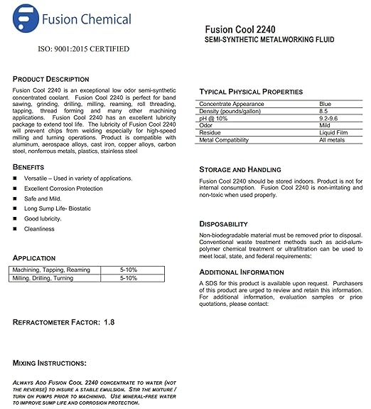 - Versatile Cutting Performance: Fusion Cool 2240 is a metal cutting oil that excels across a variety of applications including grinding, milling, CNC machining, threading, and more. Its superior formulation ensures smooth operation and precision in every cut.