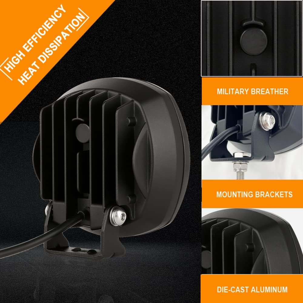 - 【EFFICIENT LIGHTING EFFECT】Each Led off road light cup is combined with spot and flood beam design. Spot beam travels quite far out and has a nice width. The amber offroad light emits super bright amber light. Give safe view in most of bad weathers like rainy days, foggy days and snowy days, make driving safer.