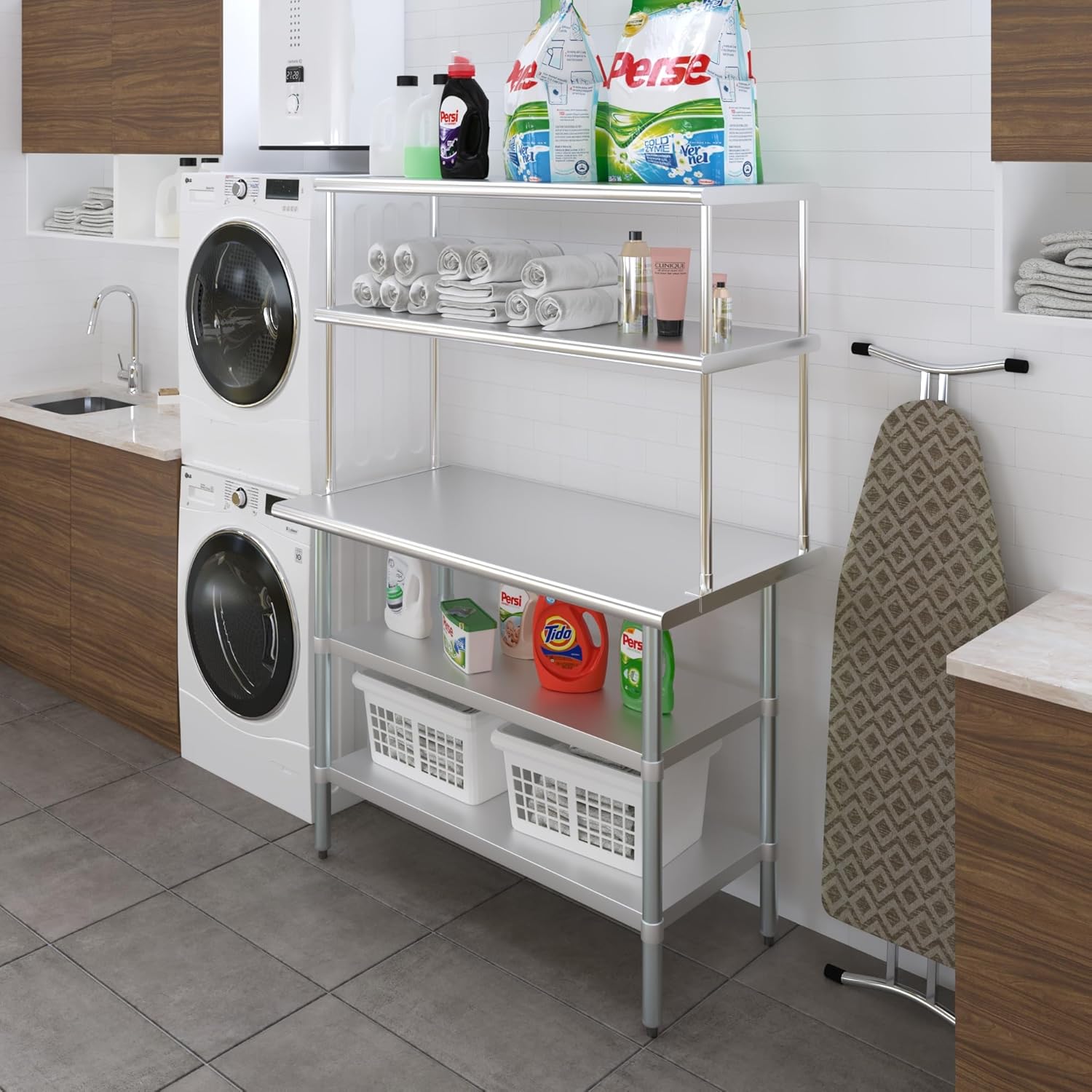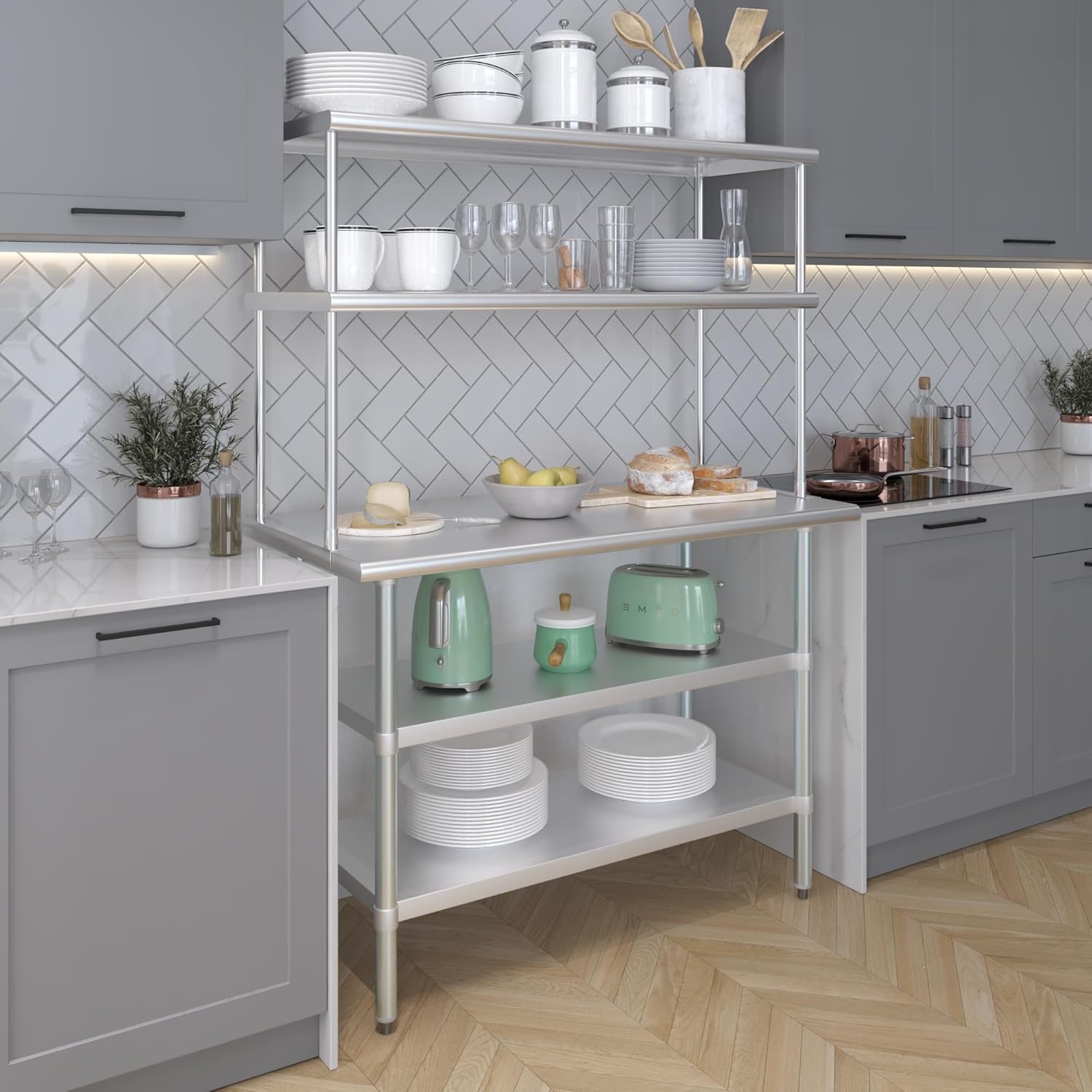- WORK SAFETY: Work table top and double tier adjustable shelves are constructed from 18-gauge stainless steel, making this restaurant prep and serve table and double tier shelf combo set is durable and long lasting. The table top comes with a galvanized under-shelf for additional storage and adjustable legs for convenience. This table and shelf set is specifically designed and finished for use in a commercial or industrial setting, but is just as reliable in the home.
