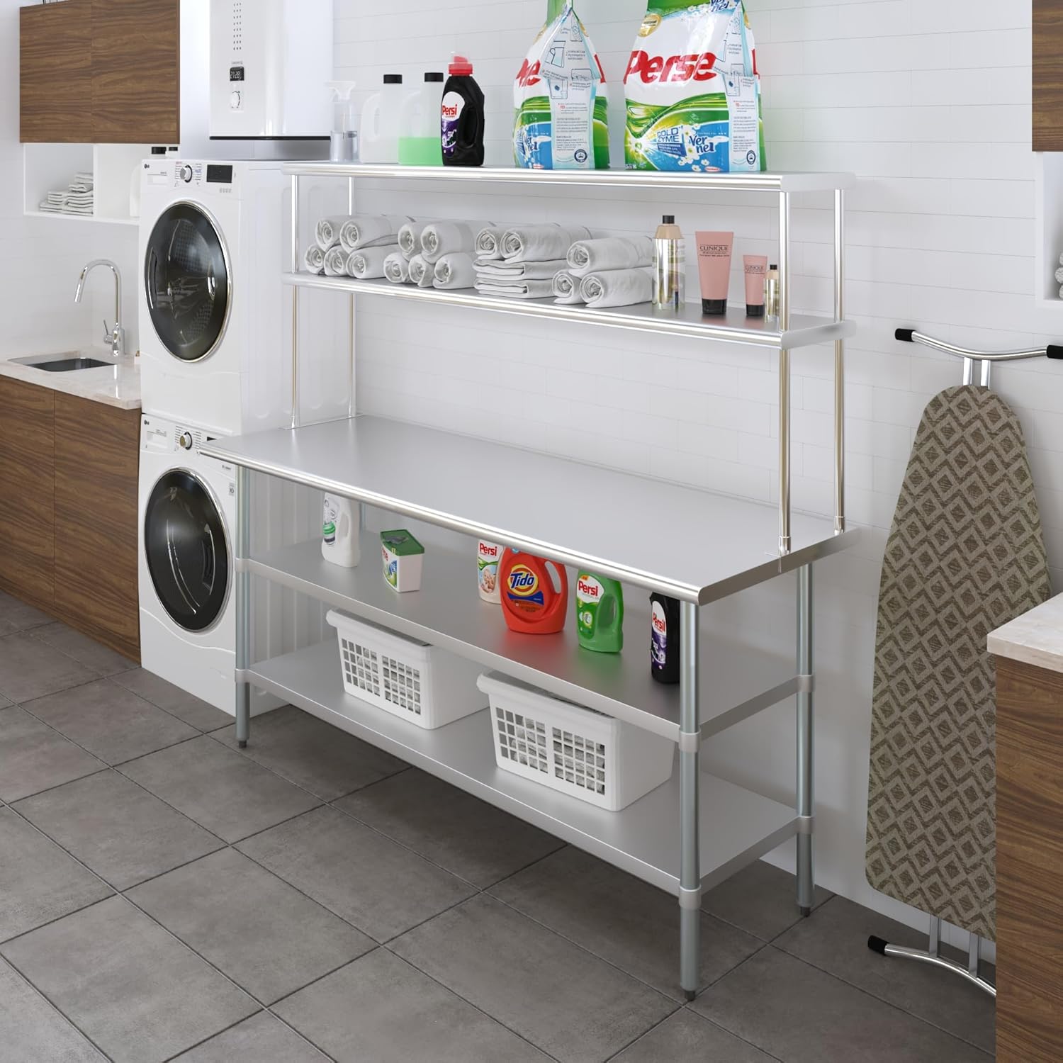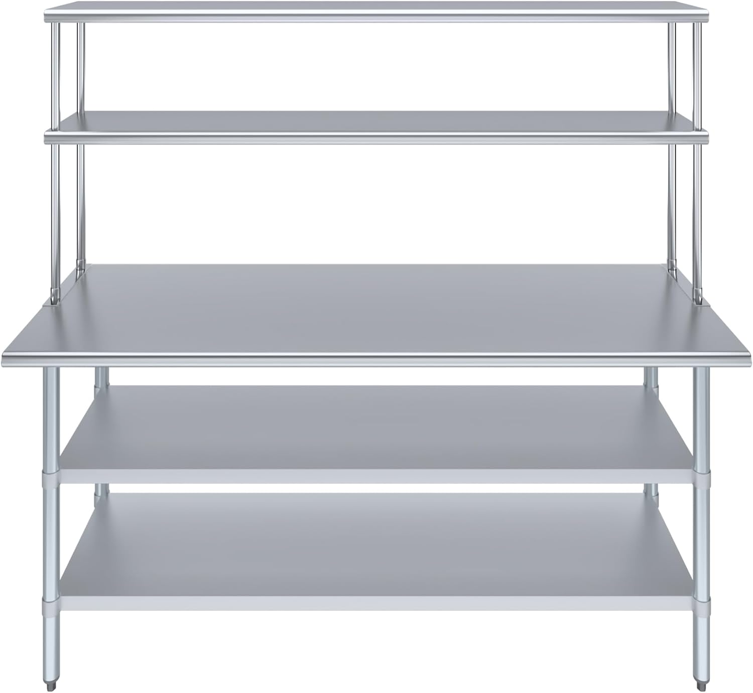 - WORK SAFETY: Work table top and double tier adjustable shelves are constructed from 18-gauge stainless steel, making this restaurant prep and serve table and double tier shelf combo set is durable and long lasting. The table top comes with a galvanized under-shelf for additional storage and adjustable legs for convenience. This table and shelf set is specifically designed and finished for use in a commercial or industrial setting, but is just as reliable in the home.