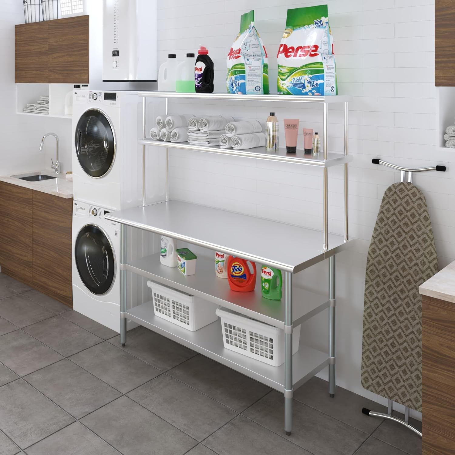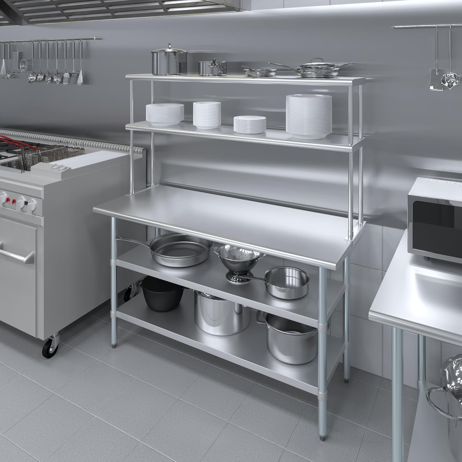 - WORK SAFETY: Work table top and double tier adjustable shelves are constructed from 18-gauge stainless steel, making this restaurant prep and serve table and double tier shelf combo set is durable and long lasting. The table top comes with a galvanized under-shelf for additional storage and adjustable legs for convenience. This table and shelf set is specifically designed and finished for use in a commercial or industrial setting, but is just as reliable in the home.