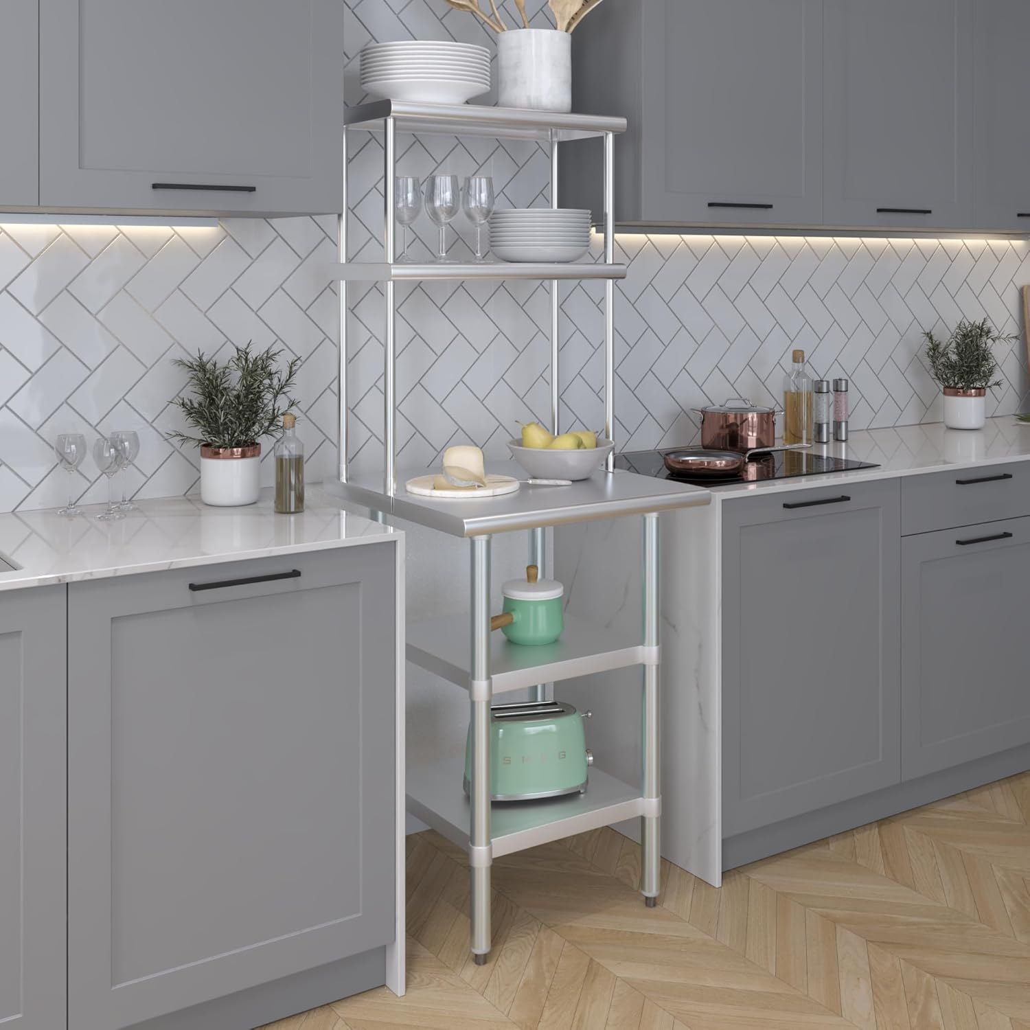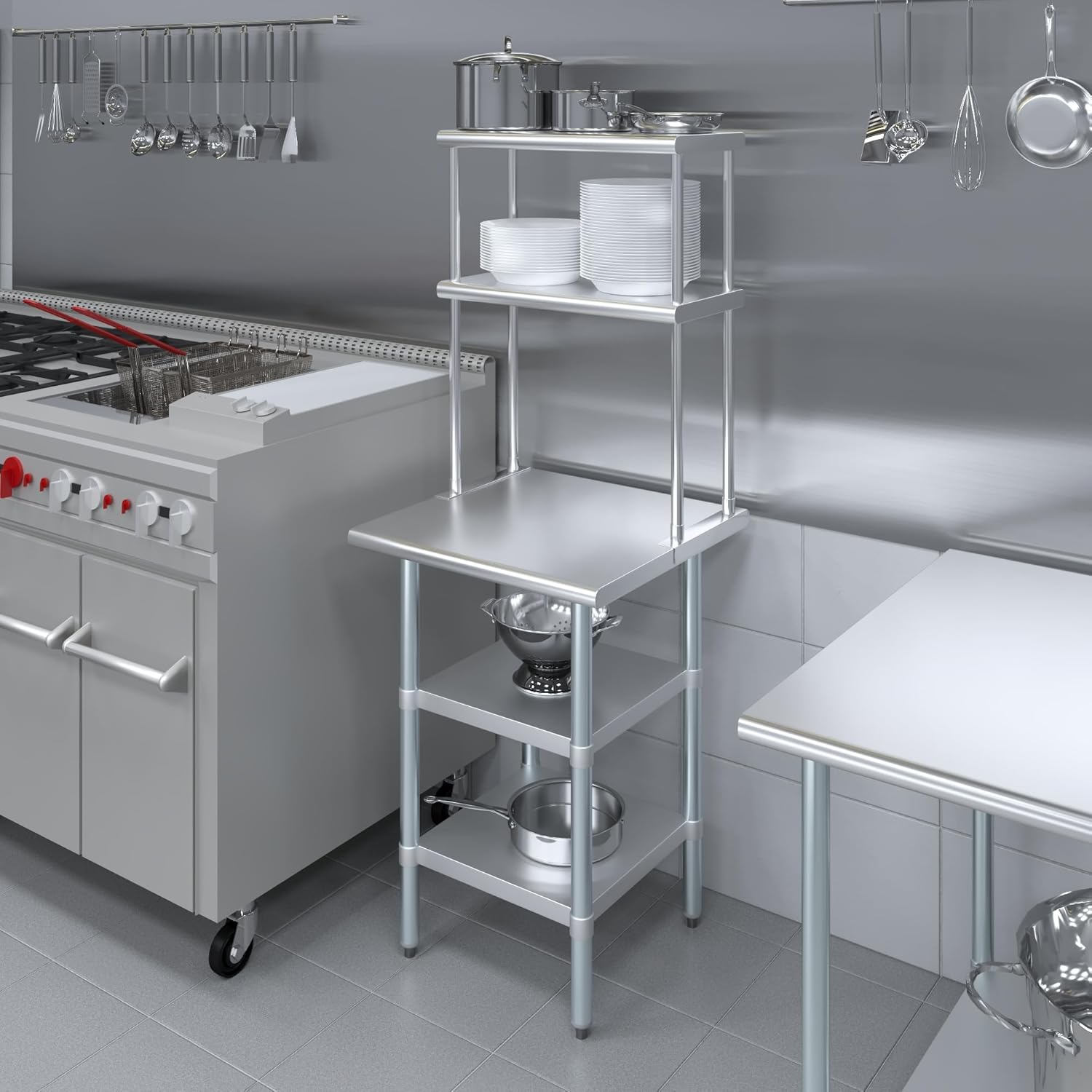 - WORK SAFETY: Work table top and double tier adjustable shelves are constructed from 18-gauge stainless steel, making this restaurant prep and serve table and double tier shelf combo set is durable and long lasting. The table top comes with a galvanized under-shelf for additional storage and adjustable legs for convenience. This table and shelf set is specifically designed and finished for use in a commercial or industrial setting, but is just as reliable in the home.
