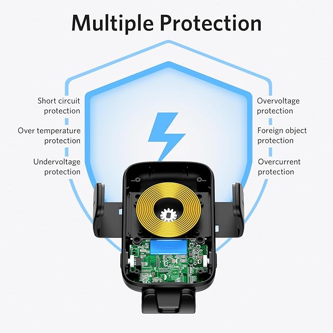 - One Tap Release & Auto-Clamping: The built-in automatic sensor automatically closes the clip arm and starts charging when you place the phone on the car wireless charger. Simply press either side of the button to easily open the clip arm and remove your phone.