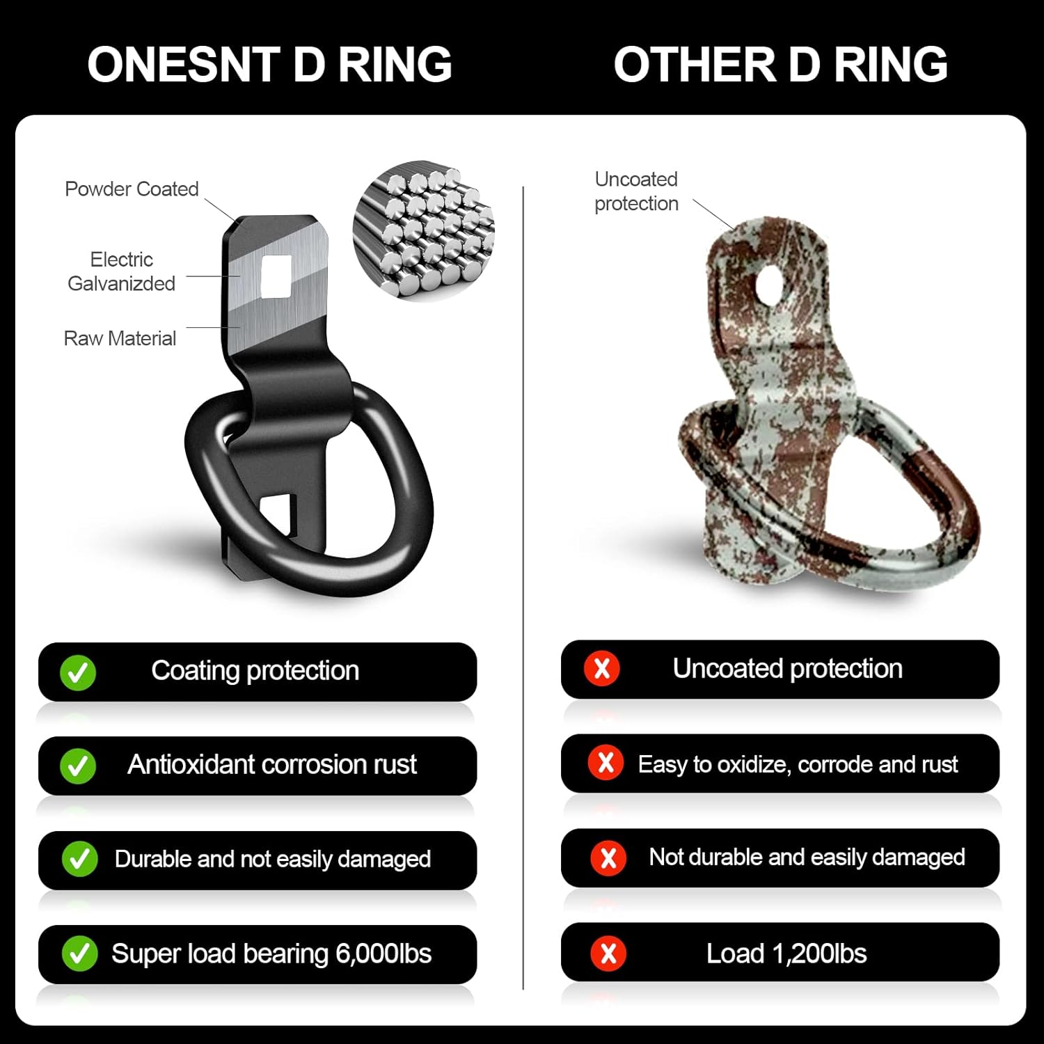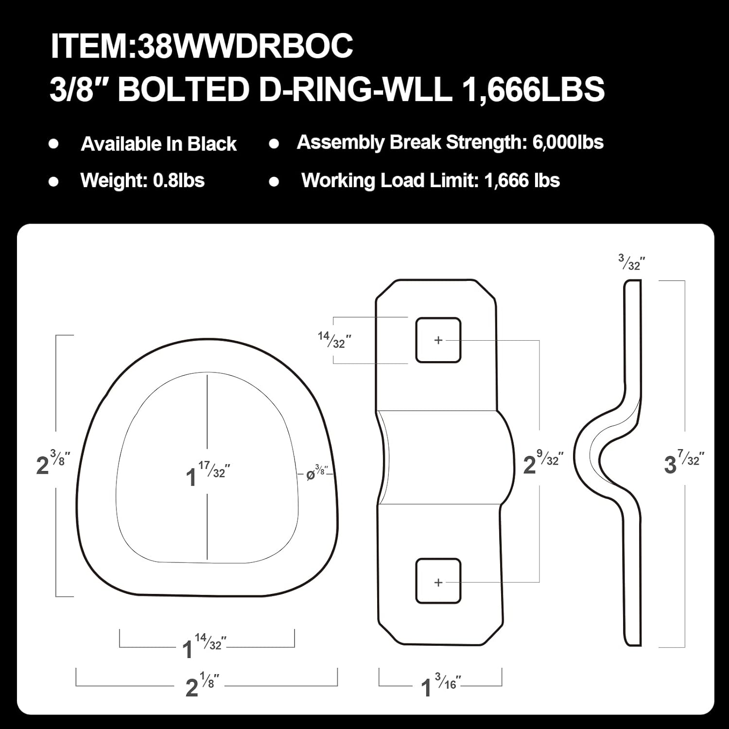 - Pack of 6 Black These medium-mini D-rings are made of exceptionally heavy duty solid steel, 3/8" diameter thick. They are strong and durable, and can handle a load up to 1,666 pounds. That means that this pack of 6 rings can bear up to 10000 pounds! See the description below for a clear guide on how to figure out your tie-down limits when loadings trucks and trailers, especially if you're up for DOT inspection Bolt on D rings