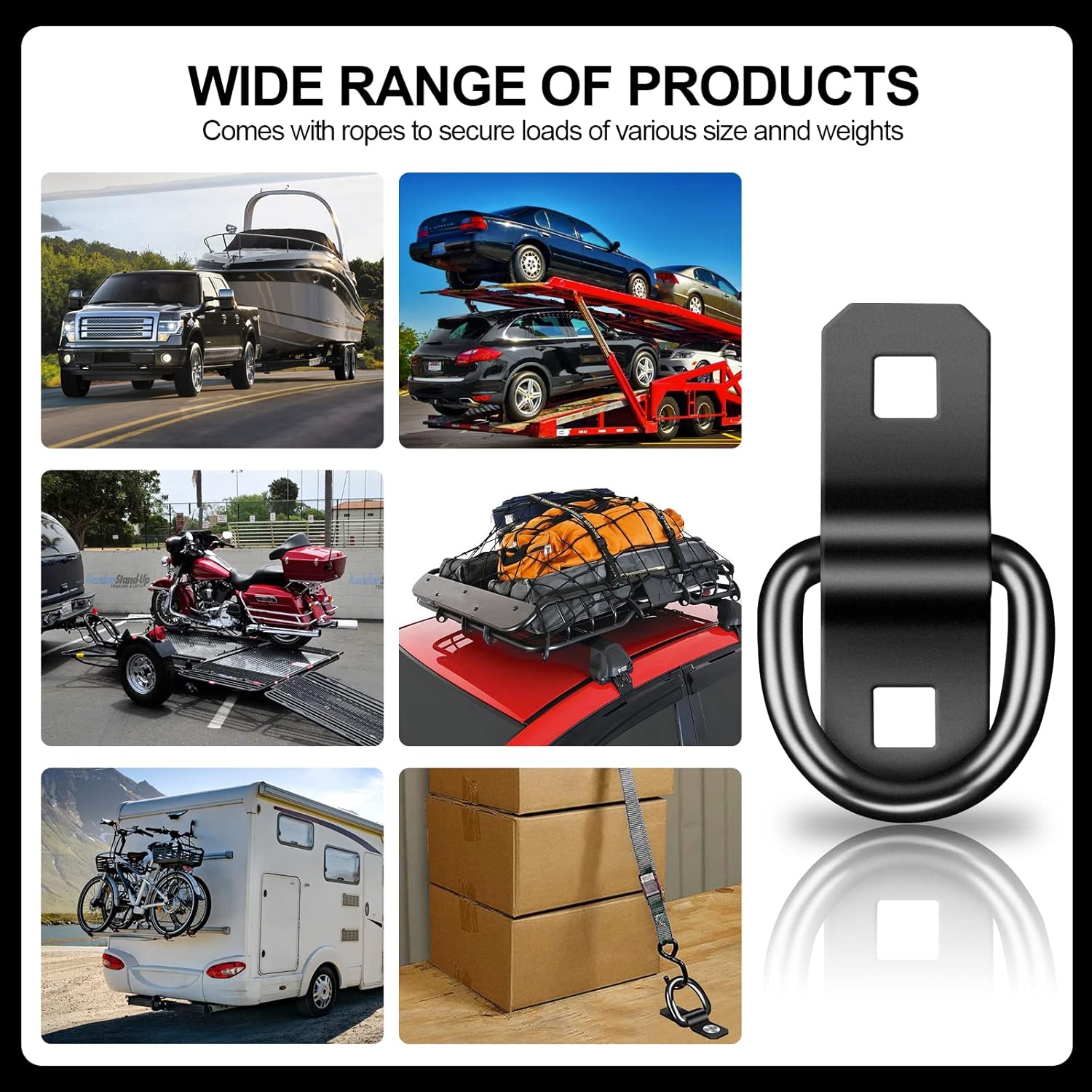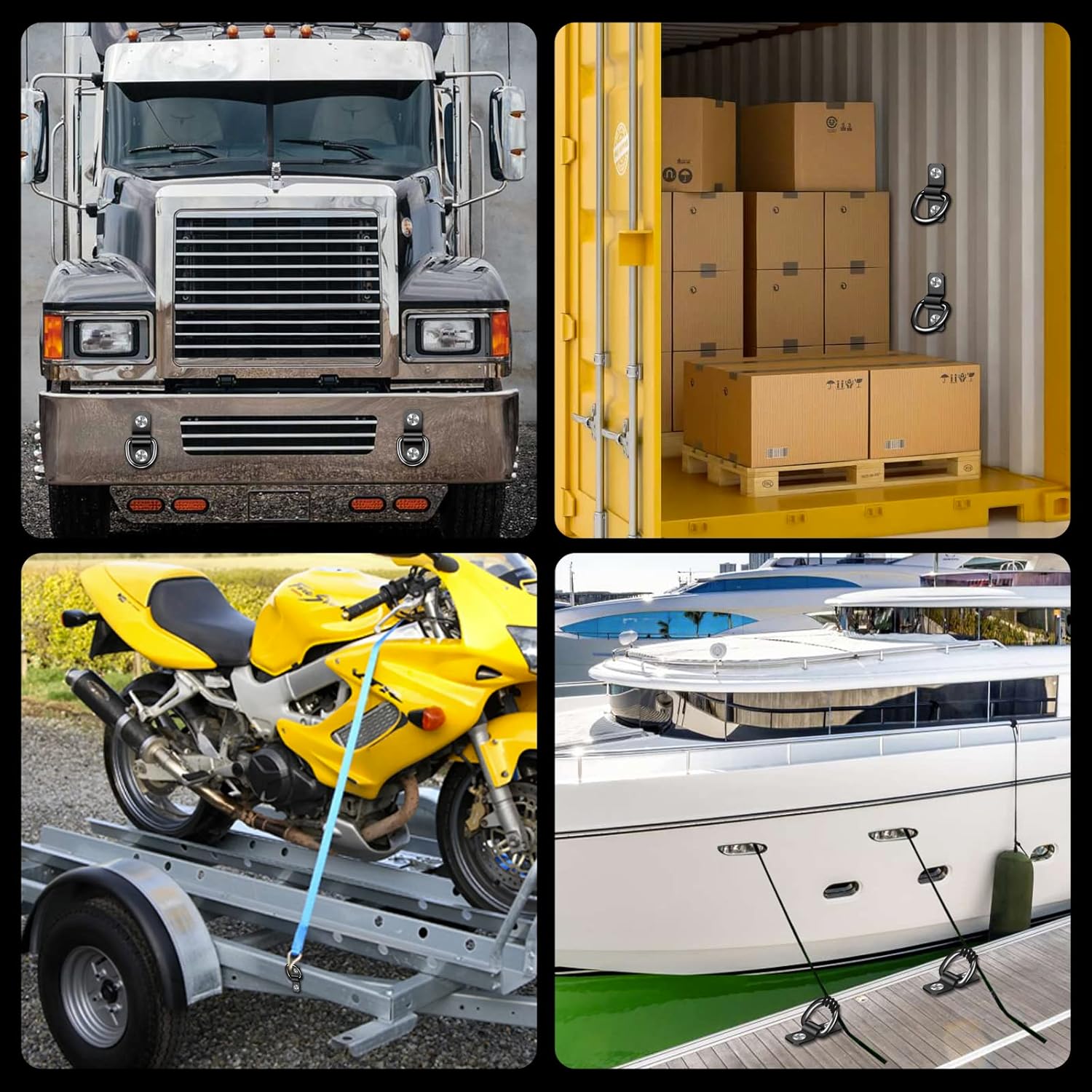 - Once these D-rings are mounted, you can use them as tie-down anchors for motorcycle straps, bungee cords, tarp straps, small chains, ratchet and cam straps, ropes, and other tie-downs. Ideal for securing kayaks, ATVs and other powersport equipment, bikes, refrigerators and similar appliances, delivery and moving boxes, camping gear, etc.