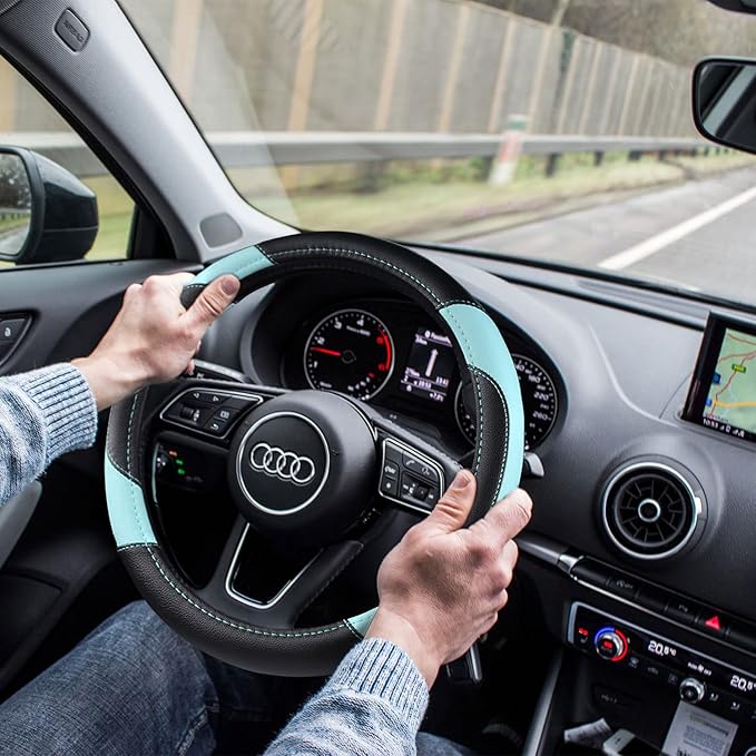 Leather Car Steering Wheel Cover, Non-Slip Car Wheel Cover Protector Breathable Microfiber Leather Universal Fit for Most Cars (Blue)