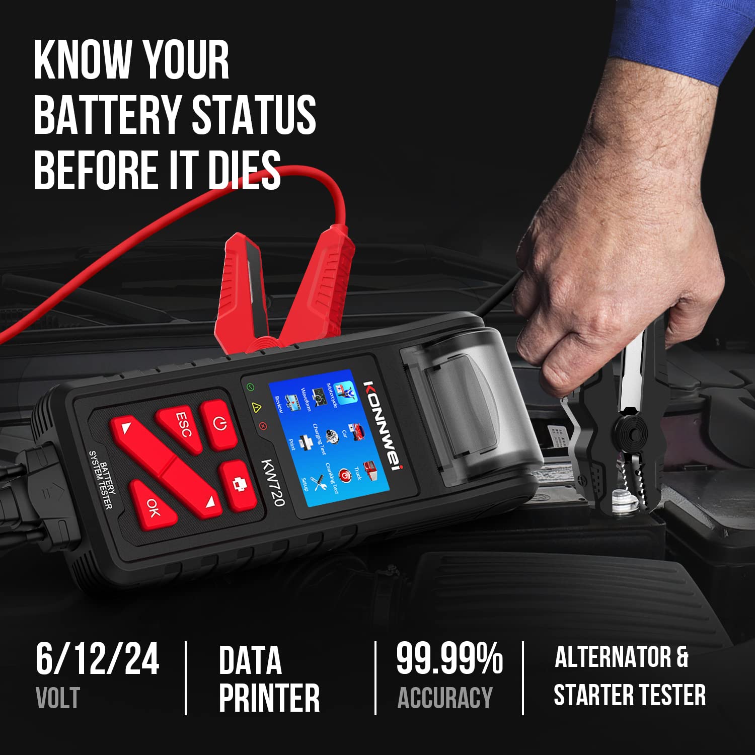 - 【PROFESSIONAL-GRADE 6V-12V-24V CAR BATTERY TESTER】 KW720 is the top 1 battery tester automotive which can works on all 6V, 12V and 24V batteries(100-2000 CCA), testing result up to 99.99% accuracy, also great alternator and starter tester, the most reliable battery load tester on the market.