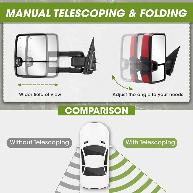 - Functions: Offer a range of functions, including switchback dynamic & arrow turn signal lights; backup lamps; running lights; heated defrost; temper sensor on the passenger side; power-adjustable flat glass; manual-adjustable convex glass and manual telescoping & folding