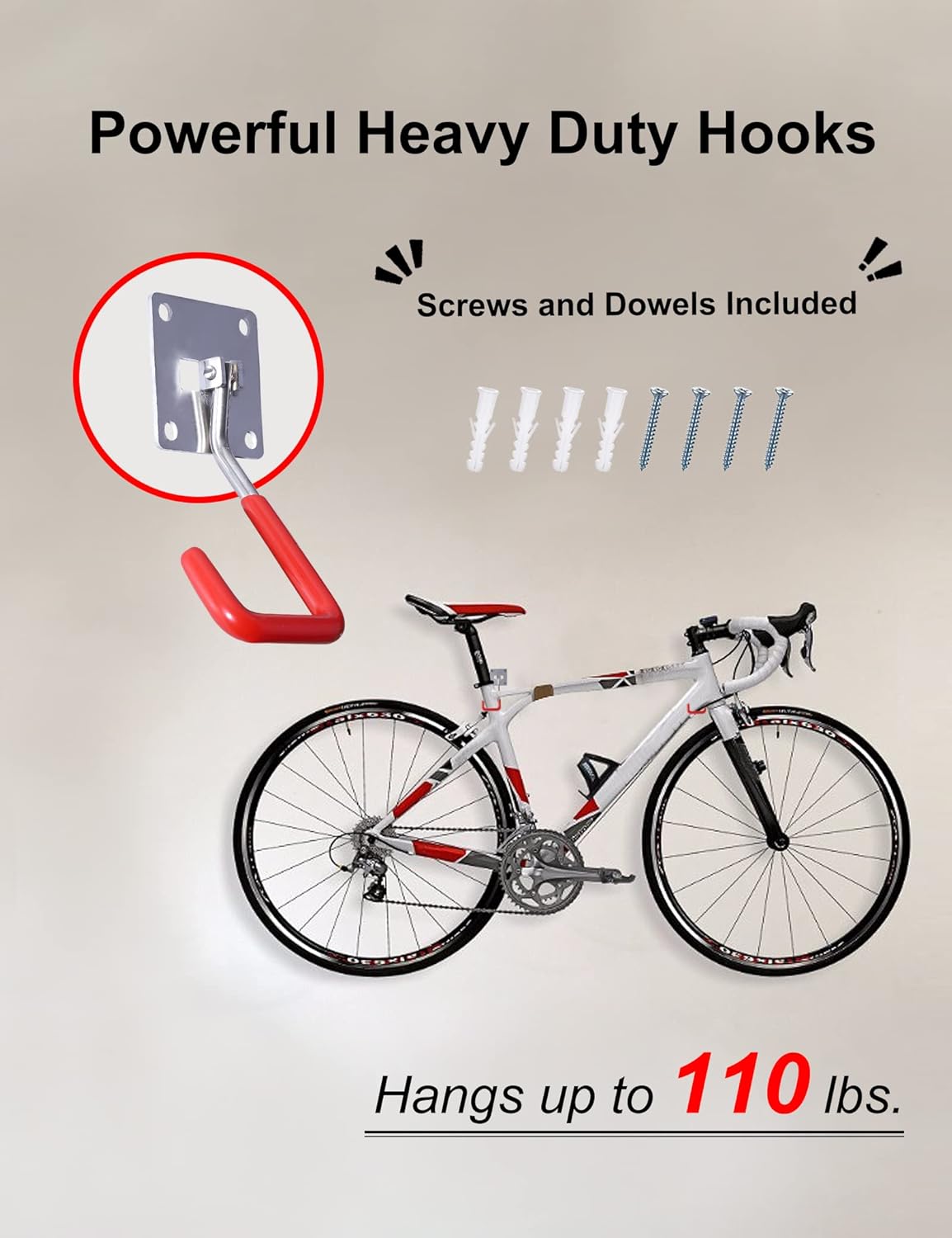 - EASY TO INSTALL: These garage hooks are applicable to all kinds of walls and wood materials and other installation surfaces. Three easy steps:1) Mark two small holes on the wall;2) Fix the white plastic anchor to the desired;3) Twist the steel screw nail into the anchor.