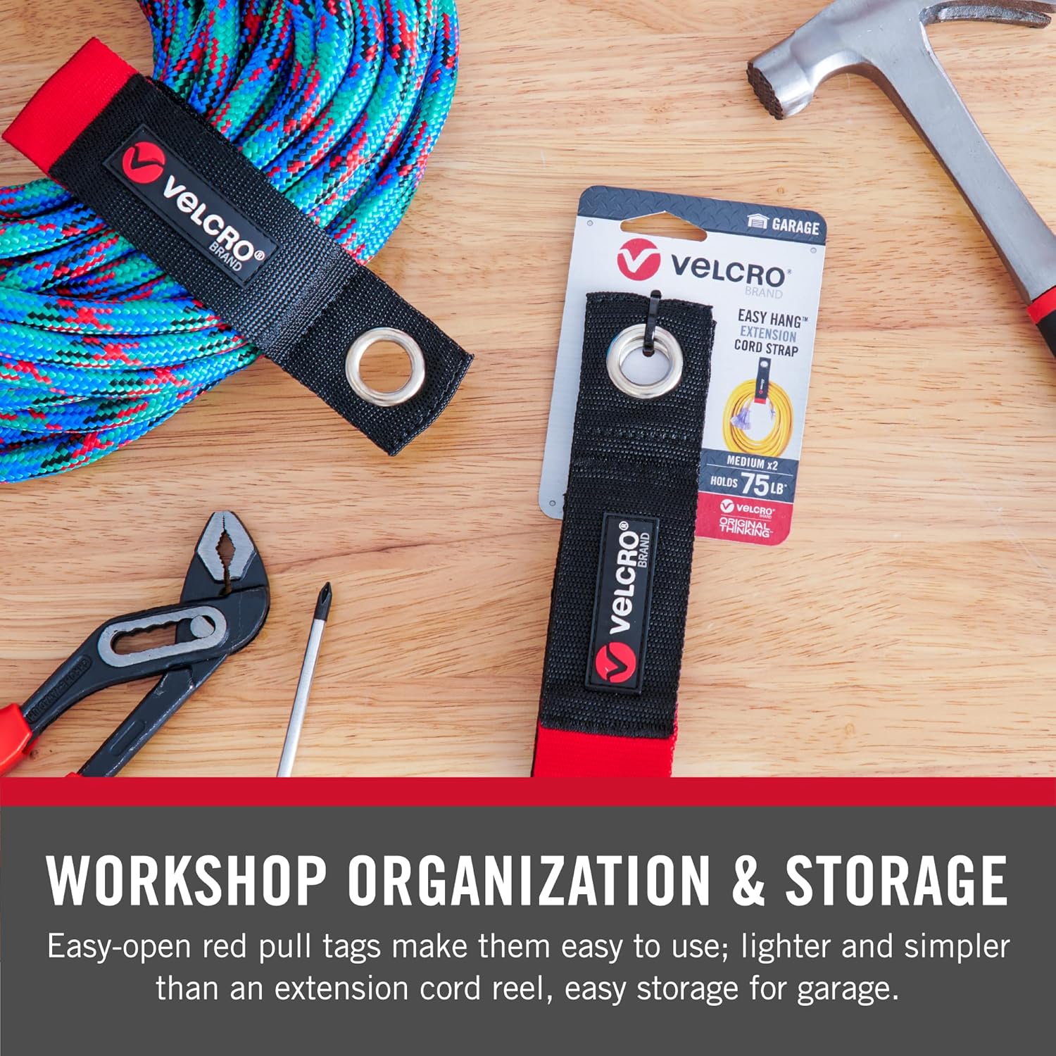 VELCRO Brand Heavy Duty Extension Cord Holder Organizer | Holds 75 Pounds, Storage Straps Hang Easily on Hooks or Nails | Perfect for Garage Organization | 2pk, Size Med 14in, Black