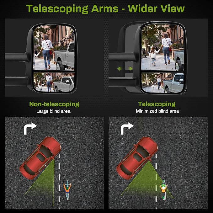 - Dual-glass: the power-adjustable plane mirror and manually adjustable convex mirror helps customize your driving positin, ensures a wider range for safe driving & towing