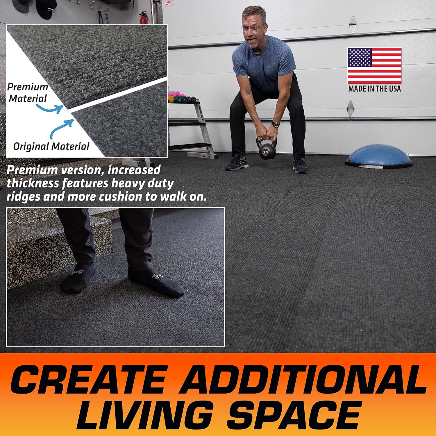 - PROTECTS SURFACES & TRANSFORMS GARAGE INTO SHOWROOM QUALITY (KEEPS FLOORS LOOKING LIKE NEW): Our mat is designed to protect your garage floor surface from oil leaks, spills, tire marks, and hide any cracks, stains, or imperfections to keep your garage looking like new. MULTI-PURPOSE: Our mat creates additional living space by turning your garage or basement into an exercise room, party room, or kids playroom. The mat has a carpet-like look and feel and is soft to walk on.