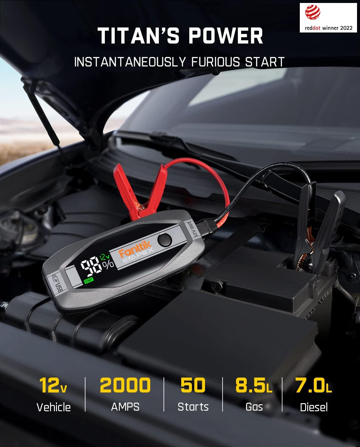 - [Titan's Power] With Titanโs jump starting power for instantaneously engine starts. Rated at 2000 Amps, this lithium car battery jump starter unleashes maximum energy to start your dead battery, especially for your supercar up to 8.5L gasoline engines and 6.0L diesel engines.