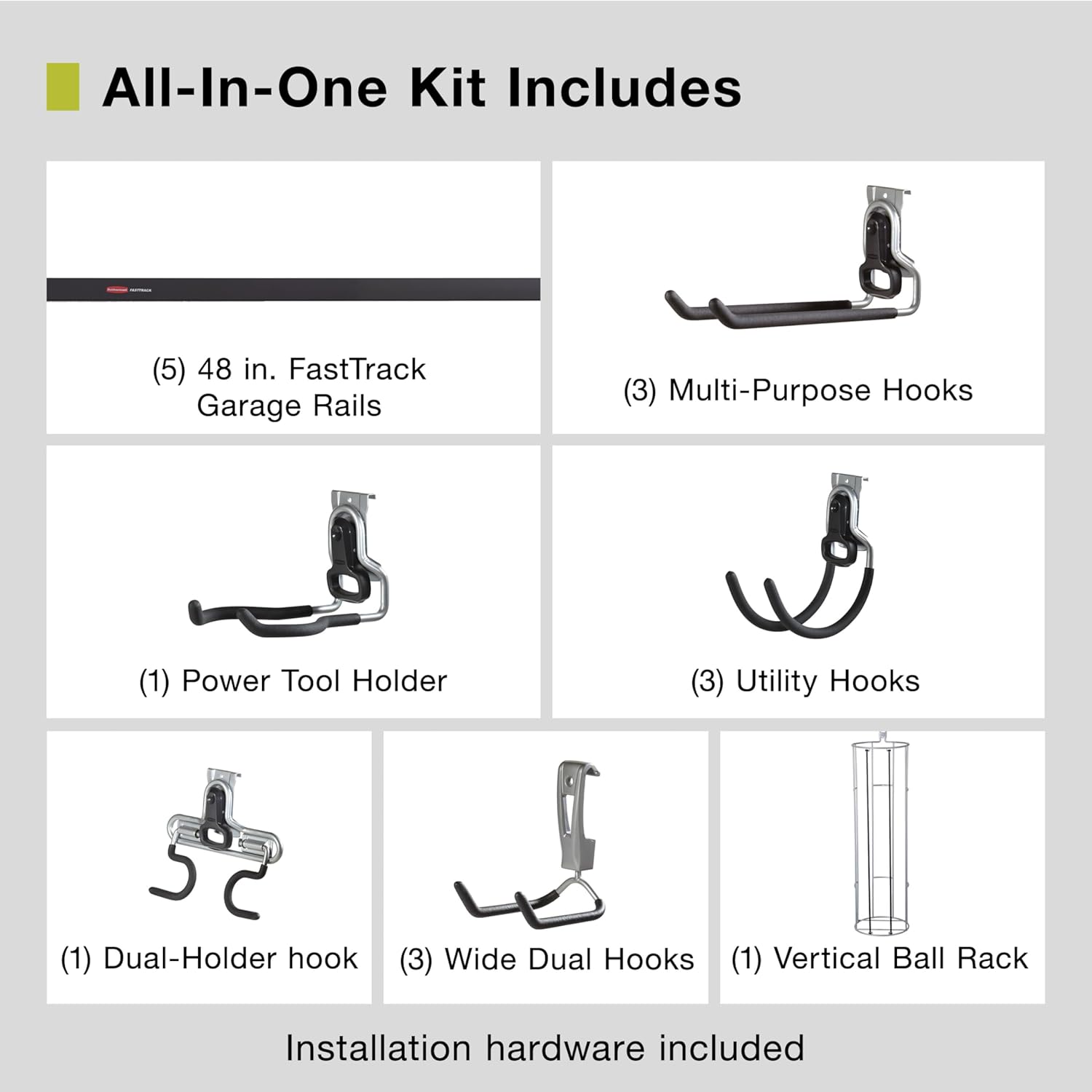 - Kit includes (5) 48-in Rail, (3) Multi-Purpose Hooks (3) Utility Hooks (3) Ladder Hooks (3) Cooler Hooks (1) Power Tool Holder (1) 2-Handle Hook (1) Vertical Ball Rack