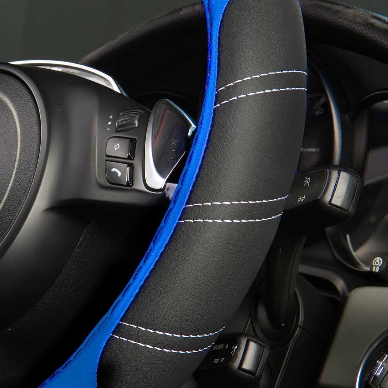 CAR PASS Line Rider Microfiber 15.5-16 Inch Leather Sporty Steering Wheel Cover Universal Fits for Truck SUV Cars Pick up, Anti-Slip Safety Comfortable Design (Black and Blue)