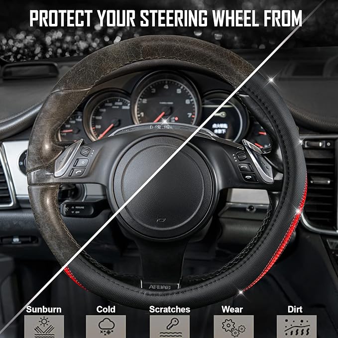 CAR PASS Bling Diamond Black Leather Steering Wheel Cover, Studded Crystal Rhinestones Universal Fit 14" 1/2-15" Glitter for Women Sparkle Girl Fit Suvs,Vans,Sedans,Car,Trucks, Red Diamond