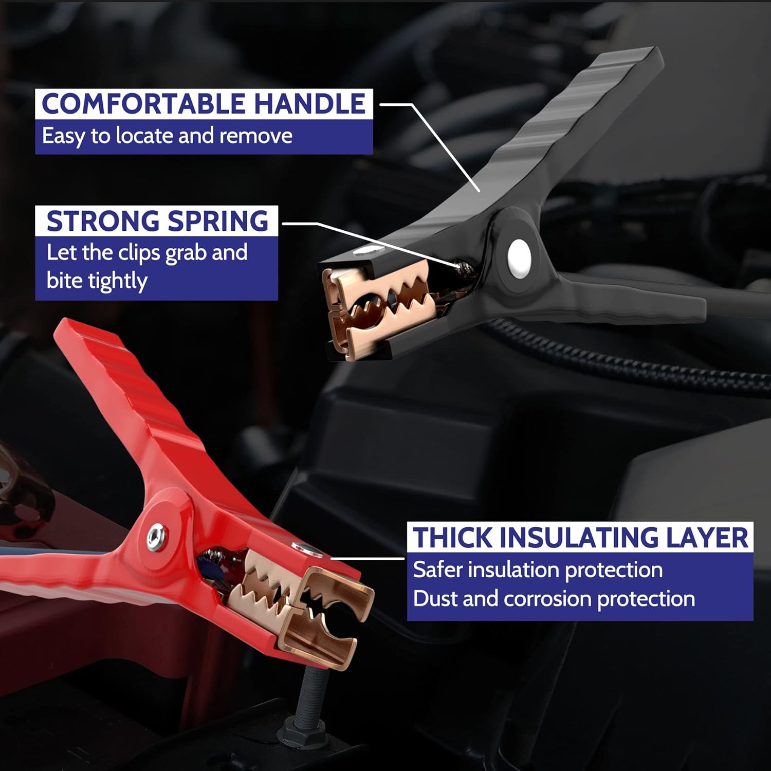 - PREMIUM FLEXIBLE CABLE - High density copper clad aluminum ensures excellent electrical conductivity. The car jumper cables remain flexible even in cold winters. The patented design of the clip with solid serrated teeth and spring is stronger than others.