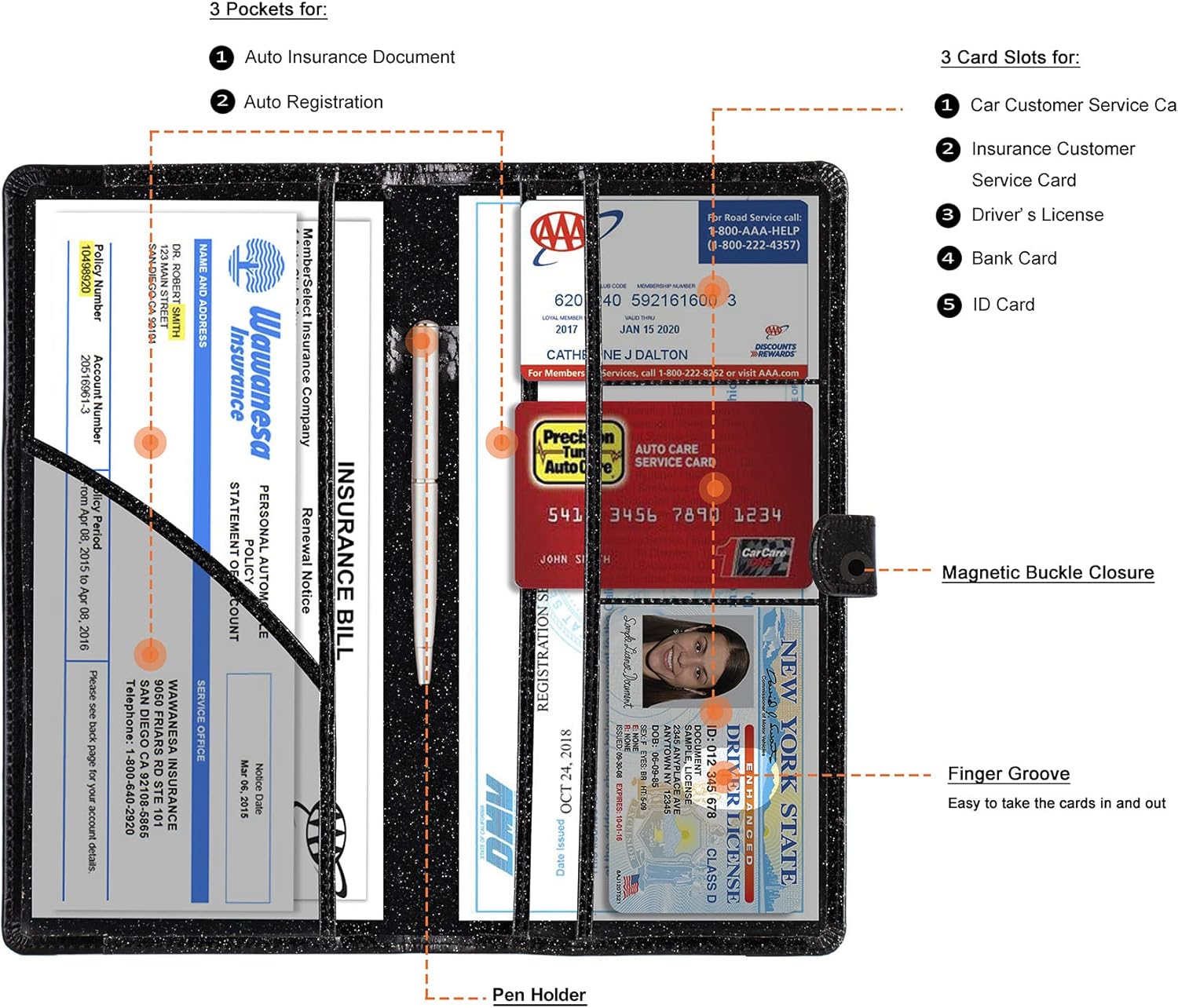 - Magnetic Buckle Closure: The auto car insurance and registration card holder are built with magnetic buckle closure, which will keep your glove box neat and tidy and ensure the certifications stay closely and completely protective within the car paper organizer.