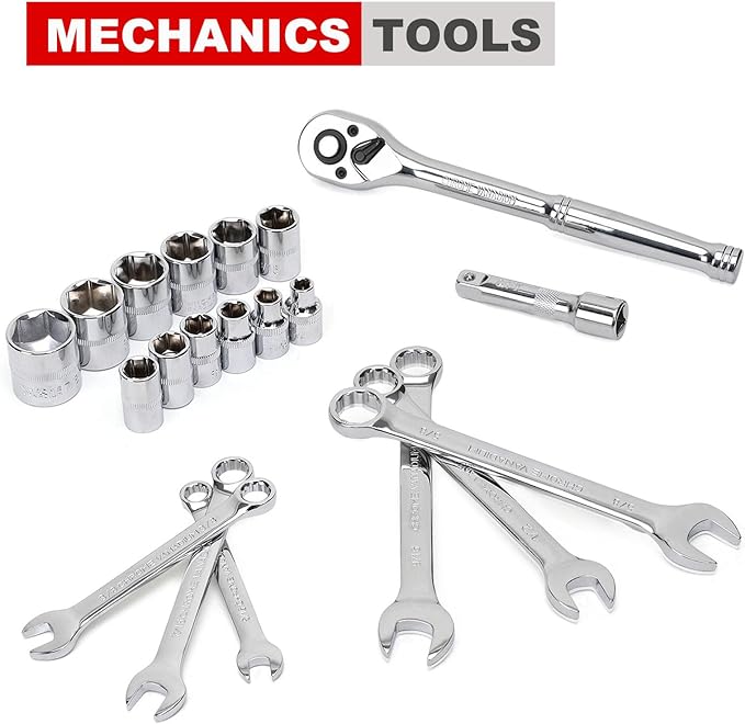 - The sockets and combination wrenches are made with heat treatment, chrome plated and polished for durability. Includes the most useful sizes to satisfy your general automotive repairs work.